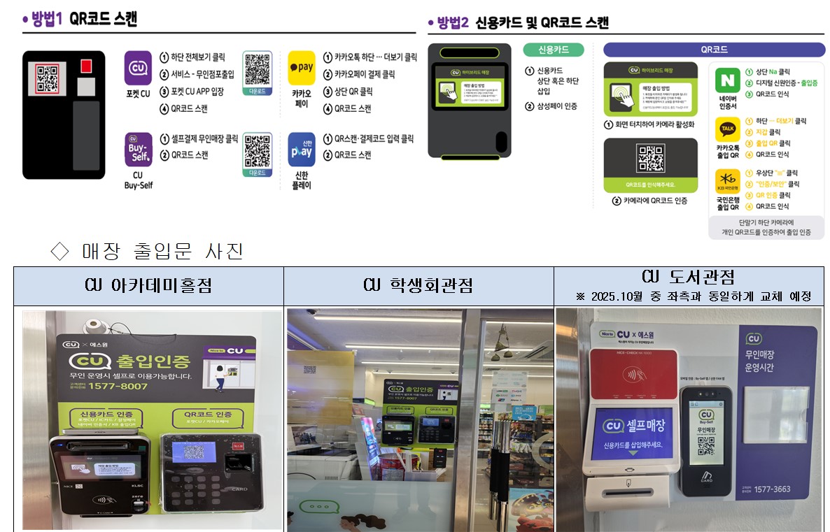국립군산대학교 소비자생활협동조합에서 운영하는 학내 편의점(CU) 운영 시스템이 하이브리드(무인점포) 시스템으로 변동되어 다음과 같이 시스템 사용 및 운영시간을 안내드리니 참고하시기 바랍니다.