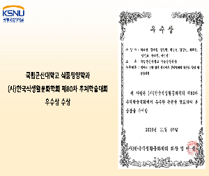 국립군산대학교 식품영양학과 조리과학연구실(지도교수 이인선) 소속의 박사과정 하혜민, 석사과정 장수정, 그리고 식품영양학과 학부생인 임성현, 백성연, 김정민, 유혜린, 김선효, 박예진 학생이 (사)한국식생활문화학회 제80차 추계학술대회에서 우수상을 수상했다. 이들은 “빌베리 분말 첨가 적양배추 곤약젤리의 항산화 활성 및 품질특성”이라는 주제로 포스터 발표를 하였으며, 천연 항산화 소재인 빌베리와 적양배추를 활용하여 제품의 기능성과 기호성을 동시에 향상시킨 점이 높게 평가되어 고부가가치 제품 개발 가능성을 제시한 연구로 우수한 평가를 받았다. &nb...