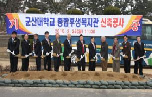 군산대학교(총장 이희연)는 군산대학교 총장, 총동문회장, 기성회장 및 주요 보직자, 학생회장, 교직원 등이 참석한 가운데 2월 22일(월) 오전 11시 군산대학교 동문 황룡호수주변에서 교직원과 지역주민의 편익을 제공하기 위한 종합후생복지관 기공식을 가졌다. 2012년 말까지 3년에 걸쳐 완공계획인 종합후생복지관은 건축면적 1,924㎡(582평), 연면적 8,064㎡(약 2,439평)의 지하 1층, 지상 4층 건물로 총사업비 109억원이 소요될 예정이다. 지하 1층(997㎡):기계실 발전기실 스쿼시장, 지상 1층(1,457㎡):커피전문점 패스트푸드 우체국 은행, 지상 2층(1,8...