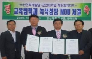 군산대학교 해양과학대학(학장 김종연)과 수산인력개발원(원장 정영훈)은 10월 29일(목) 3시 군산대학교 해양과학대학에서 수산분야 교육훈련과 녹색성장 발전을 위한 상호교류 협력 활성화를 위한 MOU를 체결하였다. 협약 결과 양 기관은 △수산분야, 녹색성장 교육훈련 및 연구개발 △교수 및 직원교류 △교육훈련협력위원회 설치 △교육 훈련 프로그램 및 교수기법 분야의 자문 △학술회의 개최 및 출판물 상호교환 △수산업 분야의 발전에 필요한 사항 등에 관해 적극적으로 상호 협력해 나가기로 했다. 국가 비전인 녹색성장을 위한 상호협력을 통해 수산업·어촌의 발전 및 인적자원 개발, 수산 분야...