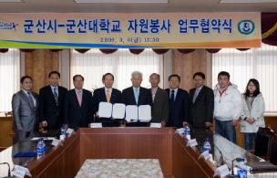 군산대학교는 3월 6일(금) 오후 1시 30분 군산대학교 본부 소회의실에서 군산시와 대학생 자원봉사 활성화를 위한 업무 협약식을 가졌다. 이번 협약식에는 이희연 군산대학교 총장 및 문동신 군산시장, 군산대학교 학생처장, 군산시의장, 황룡봉사단장, 군산시 주민생활지원국·과장, 군산대 학생지원과장, 전라북도 자원봉사센터 관계자, 군산대학교 총학생회장, 총동아리회장 등이 참석하였으며, 협약이 끝난 후에는 군산대학교 제 1학생회관에서 황룡봉사단(단장 채정룡교수) 사무실 개소식도 있었다. 대학생들이 자원봉사를 통해 나눔과 섬김의 봉사정신을 기르고 지역사회 문제를 해결해 지역발전에 기여...