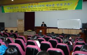 군산대학교는 개교 60주년 기념으로 11월 26일(월) 오후 3시에 종합교육관 강당에서 “한국과 미국, 그리고 동북아시아의 새로운 안보구조(Korea, the U.S. and a New Northeast Asia Security Architecture)”란 주제로 미국 레들랜즈대학교 그램 오턴 교수를 초청하여 특강을 실시하였다. 그램 오턴 교수는 동 대학 문리과대학 정부학(Government) 교수로서 캘리포니아대학교(산타바바라)에서 학사학위 및 석·박사학위를 취득하였고, 하버드대학교 국제관계연구센터에서 포스트닥 연구원으로 근무하였다. 주요 연구분야는 냉전 종식후의 국제안보환경,...