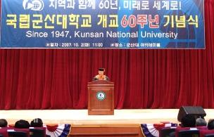 개교 60주년 기념식이 2007년 10월 2일(화) 오전 11시 군산대 아카데미홀에서 강봉균 총동창회장과 문동신군산시장 등 각급 기관단체장과 교직원 학생 동문 등 800여명이 참석한 가운데 열렸다. 이날 기념식에서 송기재 군산단지 혁신 클러스터 추진단장을 비롯 정연택(평화고교장), 이종예(군산시 총무과장), 차영옥(차병원 원장), 장인자 여사, 황호연(모드테크 대표), 라대곤(동영산업회장), 이정자(수라상 대표) 등 7명이 학교발전에 기여한 공로로 감사패를, 김민정(배드민턴 국가대표)학생이 학교를 빛낸 인물로 선정돼 총장상을 받았고, 김영재교수 등 교직원 11명이 30년 근속상을...