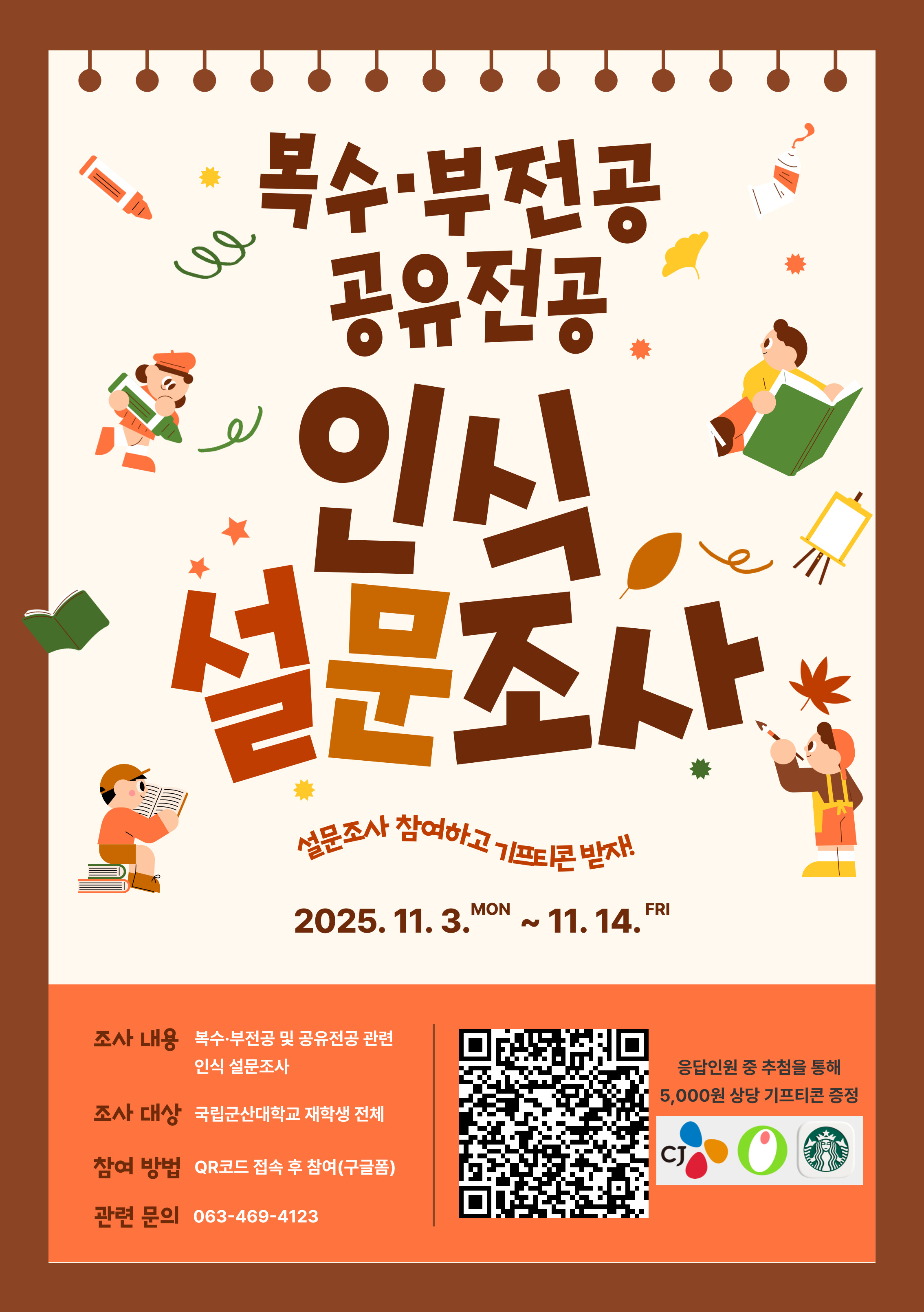 군산대 재학생의 복수·부전공 및 공유전공 이수 제도에 대한 인식과 개선요구사항을 파악하기 위해 인식 설문조사를 실시하고자 합니다.
