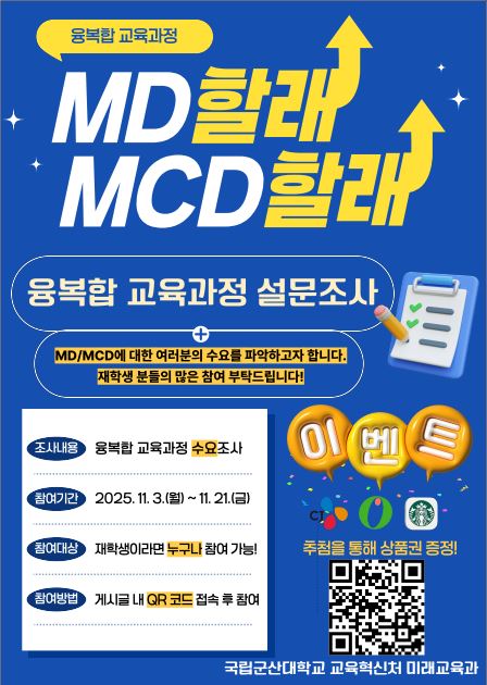 군산대 재학생의 융복합 교육과정(MD/MCD)에 대한 학습자 수요 및 개선 요구사항을 파악하기 위한 수요조사를 실시하고자 합니다.