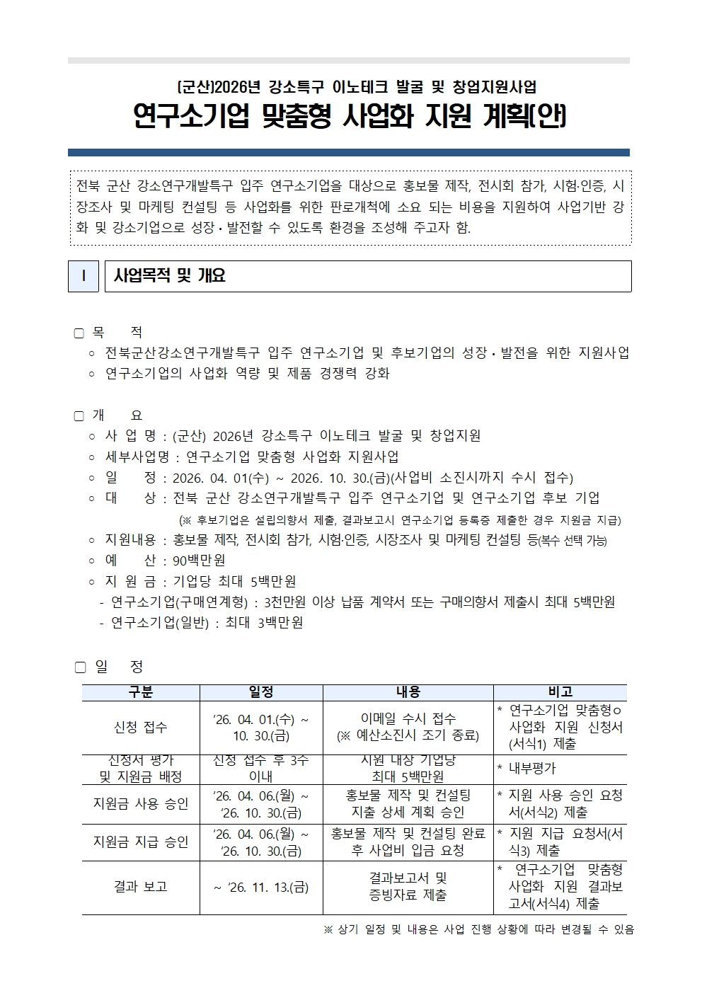 [군산 강소특구육성사업단] 2026년 연구소기업 맞춤형 사업화 지원 계획