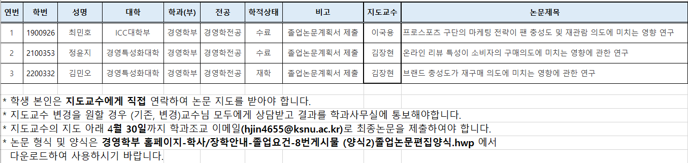 <졸업논문계획서 제출자 지도교수 안내>