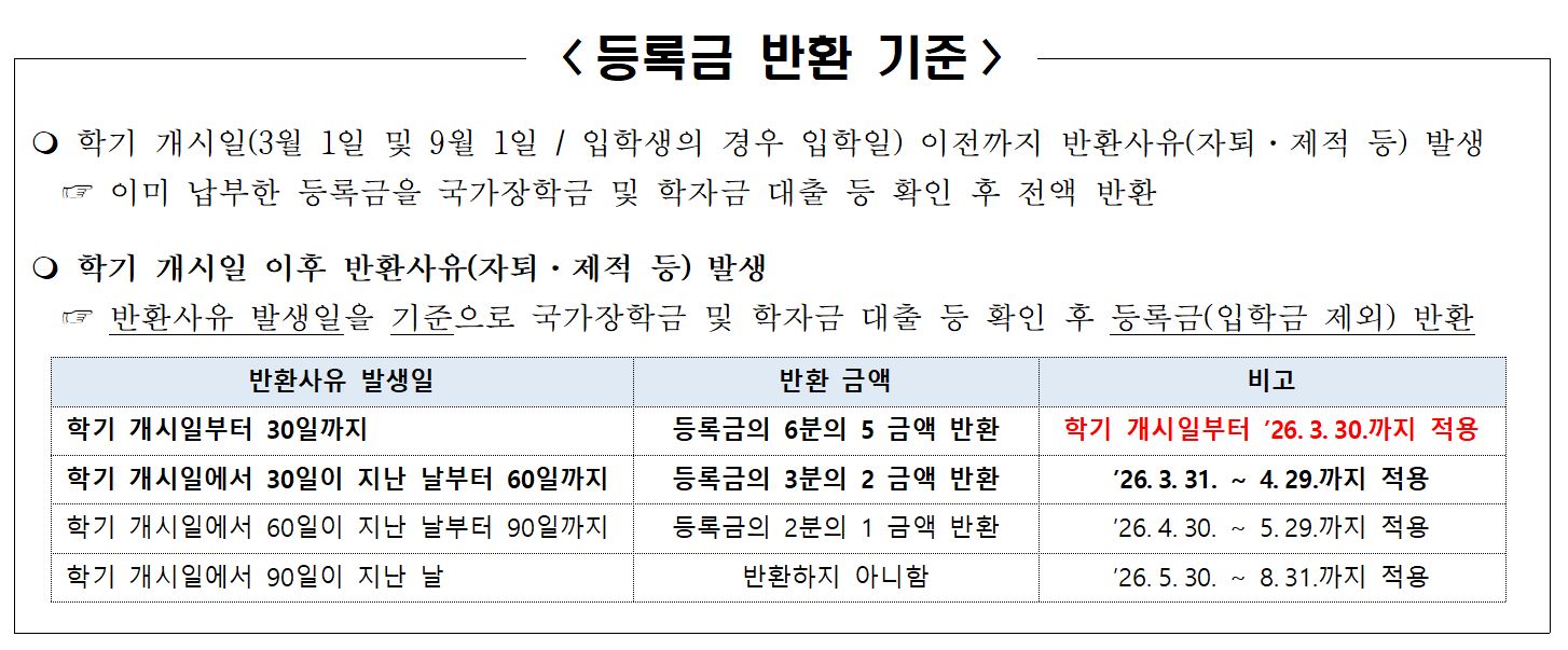 2026학년도 1학기 학적변동에 따른 등록금 반환 기준 안내