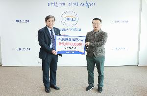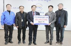 ㈜산수유리사이클 최영채 대표이사가 8일 군산대학교에 대학발전기금을 기부하였다. 기부액은 500만 원으로, 최영채 대표이사는 발전기금을 “학생 학습활동을 돕는 데 사용해주기를 바란다”며 이장호 총장에게 전달하였다. 전달식에는 산수유리사이클의 최영채 대표이사, 군산대학교 이장호 총장, 고석인 대외협력본부장, 정근목 대외협력본부 행정실장, 군산대 환경공학과 김강주 교수가 참석했다. ㈜산수유사이클은 향후 군산대학교와의 유대관계를 강화해나가며 캡스톤디자인 교육과정과 연계해 학생들의 창의적인 아이디어를 공모하는 등 학생들의 학습활동을 지원할 계획이다. 최영채 대표이사...