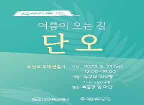 안녕하세요! 다가오는 단오를 맞이하여 5월 27일 금요일 오후 12시부터 2시까지 무료로 단오 부채 만들기 행사를 진행합니다! - 예쁜 단오 부채 만들고 올 여름 시원하고 건강하게 보내세요:)