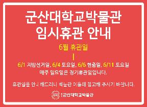 <박물관 임시휴관 안내> 박물관 시설 점검으로 인하여 임시휴관합니다. 휴관일: 6/1(수), 6/4(토), 6/6(월), 6/11(토) - 박물관 이용에 참고하시기 바라며, 관람객 여러분의 협조와 양해 부탁드립니다.