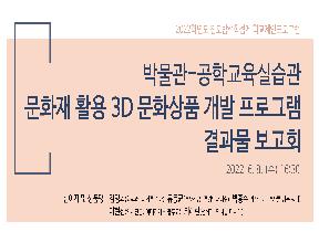 [박물관+공학교육실습관] 2022학년도 진로탐색학점제 학교제안프로그램 문화재 활용 3D 문화상품 개발 프로그램 결과 보고회 개최 # 행사일시: 2022. 6. 8.(수) 16:30~ # 행사장소: 박물관 1층 로비 # 문화상품 전시는 6/30까지 박물관 1층 로비에서 진행됩니다. 박물관과 공학교육실습관의 협업으로 진행된 "문화재 활용 3D 문화상품 개발 프로그램" 상품 결과 보고회를 개최합니다. 학생들은 이번 프로그램에서 박물관 소장 유물을 활용하여 다양한 3D 문화상품을 제작하고, ...
