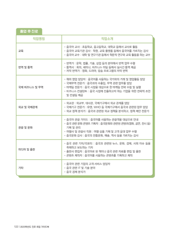 %uc9c1%uc5c5%uba85%uce6d %uc9c1%uc5c5%uc18c%uac1c%uad50%uc721- %uc911%uad6d%uc5b4 %uad50%uc0ac : %ucd08%ub4f1%ud559%uad50, %uc911%uace0%ub4f1%ud559%uad50, %ub300%ud559%uad50 %ub4f1%uc5d0%uc11c %uad50%uc0ac%ub85c %ud65c%ub3d9- %uc911%uad6d%uc5b4 %uad50%uc721%uae30%uad00 %uac15%uc0ac : %ud559%uc6d0, %uad50%uc721 %ud50c%ub7ab%ud3fc %ub4f1%uc5d0%uc11c %uc911%uad6d%uc5b4%ub97c %uac00%ub974%uce58%ub294 %uac15%uc0ac- %uc911%uad6d%uc5b4 %uad50%uc218 : %ub300%ud559 %ubc0f %uc5f0%uad6c%uae30%uad00 %ub4f1%uc5d0%uc11c %ud559%ubb38%uc801 %uc5f0%uad6c%uc640 %uad50%uc721 %ud65c%ub3d9%uc744 %ud558%ub294 %uad50%uc218%ubc88%uc5ed %ubc0f %ud1b5%uc5ed- %ubc88%uc5ed%uac00 : %ubb38%ud559, %ubc95%ub960, %uae30%uc220, %uc0c1%uc5c5 %ub4f1%uc758 %ubd84%uc57c%uc5d0%uc11c %ubc88%uc5ed %uc5c5%ubb34 %uc218%ud589- %ud1b5%uc5ed%uc0ac : %ud68c%uc758, %uc138%ubbf8%ub098, %ube44%uc988%ub2c8%uc2a4 %ubbf8%ud305 %ub4f1%uc5d0%uc11c %uc2e4%uc2dc%uac04 %ud1b5%uc5ed %uc81c%uacf5- %uc790%ub9c9 %ubc88%uc5ed%uac00 : %uc601%ud654, %ub4dc%ub77c%ub9c8, %ubc29%uc1a1 %ud504%ub85c%uadf8%ub7a8%uc758 %uc790%ub9c9 %ubc88%uc5ed%uad6d%uc81c %ube44%uc988%ub2c8%uc2a4 %ubc0f %ubb34%uc5ed - %ud574%uc678 %uc601%uc5c5 %ub2f4%ub2f9%uc790 : %uc911%uad6d%uc5b4%ub97c %uc0ac%uc6a9%ud558%ub294 %uad6d%uac00%uc640%uc758 %uac70%ub798 %ubc0f %uc601%uc5c5%ud65c%ub3d9 %ub2f4%ub2f9- %uad6d%uc81c%ubb34%uc5ed %uc804%ubb38%uac00 : %uc911%uad6d%uacfc%uc758 %uc218%ucd9c%uc785, %ubb34%uc5ed %uad00%ub828 %uc5c5%ubb34%ub97c %ub2f4%ub2f9- %ub9c8%ucf00%ud305 %uc804%ubb38%uac00 : %uc911%uad6d %uc2dc%uc7a5%uc744 %ub300%uc0c1%uc73c%ub85c %ud55c %ub9c8%ucf00%ud305 %uc804%ub7b5 %uc218%ub9bd %ubc0f %uc2e4%ud589- %ube44%uc988%ub2c8%uc2a4 %ucee8%uc124%ud134%ud2b8 : %uc911%uad6d %uc2dc%uc7a5%uc5d0 %uc9c4%ucd9c%ud558%uace0%uc790 %ud558%ub294 %uae30%uc5c5%uc744 %uc704%ud55c %uc804%ub7b5%uc801 %uc870%uc5b8 %ubc0f %ucee8%uc124%ud305 %uc81c%uacf5%uc678%uad50 %ubc0f %uad6d%uc81c%uad00%uacc4- %uc678%uad50%uad00 : %uc678%uad50%ubd80, %ub300%uc0ac%uad00, %uad6d%uc81c%uae30%uad6c%uc5d0%uc11c %uc678%uad50 %uad00%uacc4%ub97c %ub2f4%ub2f9- %uad6d%uc81c%uae30%uad6c %uc804%ubb38%uac00 : %uc720%uc5d4, WHO %ub4f1 %uad6d%uc81c%uae30%uad6c%uc5d0%uc11c %uc911%uad6d%uacfc %uad00%ub828%ub41c %uc5c5%ubb34 %ub2f4%ub2f9- %uc678%uad50 %uc815%ucc45 %ubd84%uc11d%uac00 : %uc911%uad6d%uacfc %uad00%ub828%ub41c %uc678%uad50 %uc815%ucc45%uc744 %ubd84%uc11d%ud558%uace0, %uc815%ucc45 %uc81c%uc548 %uc804%ubb38%uac00 %uad00%uad11 %ubc0f %ubb38%ud654- %uc911%uad6d%uc5b4 %uad00%uad11 %uac00%uc774%ub4dc : %uc911%uad6d%uc5b4%ub97c %uc0ac%uc6a9%ud558%ub294 %uad00%uad11%uac1d%uc744 %ub300%uc0c1%uc73c%ub85c %uc548%ub0b4- %uc911%uad6d %uad00%ub828 %ubb38%ud654 %ucf58%ud150%uce20 %uae30%ud68d%uc790 : %uc911%uad6d%ubb38%ud654%uc640 %uad00%ub828%ub41c %ucf58%ud150%uce20(%uc601%ud654, %uacf5%uc5f0, %uc804%uc2dc %ub4f1) %uae30%ud68d %ubc0f %uad00%ub9ac- %uc5ec%ud589%uc0ac %ubc0f %uad00%uad11%uc0ac %uc9c1%uc6d0 : %uc5ec%ud589 %uc0c1%ud488 %uae30%ud68d %ubc0f %uace0%uac1d %uc751%ub300 %uc5c5%ubb34 %uc218%ud589- %uc911%uad6d%ubb38%ud654 %uac15%uc0ac : %uc911%uad6d%uc758 %uc804%ud1b5%ubb38%ud654, %uc608%uc220, %uc5ed%uc0ac %ub4f1%uc744 %uac00%ub974%uce58%ub294 %uac15%uc0ac%ubbf8%ub514%uc5b4 %ubc0f %ucd9c%ud310- %uc911%uad6d %uad00%ub828 %uae30%uc790/%ub9ac%ud3ec%ud130 : %uc911%uad6d%uacfc %uad00%ub828%ub41c %ub274%uc2a4, %ubb38%ud654, %uacbd%uc81c, %uc0ac%ud68c %uc774%uc288 %ub4f1%uc744 %ucde8%uc7ac%ud558%uace0 %ubcf4%ub3c4%ud558%ub294 %uae30%uc790- %ucd9c%ud310%uc0ac %ud3b8%uc9d1%uc790 : %uc911%uad6d%uc5b4%ub85c %ub41c %ucc45%uc774%ub098 %uc911%uad6d %uad00%ub828 %uc790%ub8cc%ub97c %ud3b8%uc9d1 %ubc0f %ucd9c%ud310- %ucf58%ud150%uce20 %uc81c%uc791%uc790 : %uc911%uad6d%uc5b4%ub97c %uc0ac%uc6a9%ud558%ub294 %ucf58%ud150%uce20%ub97c %uae30%ud68d%ud558%uace0 %uc81c%uc791%uae30%ud0c0- %uc911%uad6d%uc5b4 %uad00%ub828 %uae30%uc5c5%uc758 %uace0%uac1d %uc11c%ube44%uc2a4 %ub2f4%ub2f9%uc790- %uc911%uad6d %uad00%ub828 IT %ubc0f %uae30%uc220 %ubd84%uc57c- %uc911%uad6d %uacbd%uc81c %ubd84%uc11d%uac00%uc878%uc5c5 %ud6c4 %uc9c4%ub85c122 | 2025%ud559%ub144%ub3c4 %uc9c4%ub85c %ucde8%uc5c5 %uac00%uc774%ub4dc%ubd81