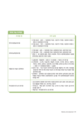%ucde8%ub4dd %uac00%ub2a5 %uc790%uaca9%uc99d%uc790%uaca9%uc99d %uba85 %uc790%uaca9 %uc124%uba85%ud55c%uad6d%uc0ac%uac80%uc815%ub2a5%ub825%uc2dc%ud5d81) %uc778%uc99d %ub4f1%uae09 : %uc2ec%ud654 %u2192 1%uae09(80%uc810 %uc774%uc0c1), 2%uae09(70~70%uc810), 3%uae09(60~69%uc810) / %ubb38%ud56d %uc218 50%ubb38%ud56d(5%uc9c0 %ud0dd1%ud615)2) %uc778%uc99d %ub4f1%uae09 : %uae30%ubcf8 %u2192 4%uae09(80%uc810 %uc774%uc0c1), 5%uae09(70~79%uc810), 6%uae09(60~69%uc810) / %ubb38%ud56d %uc218 50%ubb38%ud56d(4%uc9c0 %ud0dd1%ud615)%uc138%uacc4%uc0ac%ub2a5%ub825%uac80%uc815%uc2dc%ud5d81) %uc778%uc99d %ub4f1%uae09 : %uc2ec%ud654 %u2192 1%uae09(90%uc810 %uc774%uc0c1), 2%uae09(80%uc810 %uc774%uc0c1), 3%uae09(70%uc810 %uc774%uc0c1)2) %uc778%uc99d %ub4f1%uae09 : %uae30%ubcf8 %u2192 4%uae09(60%uc810 %uc774%uc0c1), 5%uae09(50%uc810 %uc774%uc0c1), 6%uae09(40%uc810 %uc774%uc0c1)* %ubb38%ud56d %uc218 : %ucd1d 50%ubb38%uc81c %ucd9c%uc81c, %uac1d%uad00%uc2dd 46%ubb38%uc81c, %uc8fc%uad00%uc2dd 4%ubb38%uc81c(%ub2e8%ub2f5%ud615%uacfc %uc11c%uc220%ud615 %ubb38%uc81c %ud63c%ud569, %ub3d9%uc591%uc0ac%uc640 %uc11c%uc591%uc0ac %uade0%ub4f1)%ubc15%ubb3c%uad00 %ubc0f %ubbf8%uc220%uc0ac %uc900%ud559%uc608%uc0ac1) %uacf5%ud1b5%uacfc%ubaa9 : %ubc15%ubb3c%uad00%ud559 %u2192 %ubb38%ud56d %uc218 %uac01 40%ubb38%ud56d %u2192 %uac1d%uad00%uc2dd 4%uc9c0 %ud0dd1%ud6152) %uc120%ud0dd%uacfc%ubaa9 : %uace0%uace0%ud559, %ubbf8%uc220%uc0ac%ud559, %uc608%uc220%ud559, %ubbfc%uc18d%ud559, %uc11c%uc9c0%ud559, %ud55c%uad6d%uc0ac, %uc778%ub958%ud559, %uc790%uc5f0%uc0ac, %uacfc%ud559%uc0ac, %ubb38%ud654%uc0ac, %ubcf4%uc874%uacfc%ud559, %uc804%uc2dc%uae30%ud68d%ub860, %ubb38%ud559%uc0ac %uc911 %ud0dd2 [13%uac1c %uacfc%ubaa9] %u2192 %ubb38%ud56d %uc218 %uac01 2%ubb38%ud56d(%ucd1d 4%ubb38%ud56d) %u2192 %ub17c%uc220%ud6153) %ud569%uaca9 %uae30%uc900 : %uae30%uc900 %uc774%uc0c1%uc758 %uc678%uad6d%uc5b4%uc2dc%ud5d8 %uc810%uc218%ub97c %uc81c%ucd9c%ud558%uace0 %ub9e4 %uacfc%ubaa9 100%uc810%uc744 %ub9cc%uc810%uc73c%ub85c %ud558%uc5ec %ub9e4 %uacfc%ubaa9 40%uc810 %uc774%uc0c1%uacfc %uc804 %uacfc%ubaa9 %ud3c9%uade0 60%uc810 %uc774%uc0c1 %ub4dd%uc810%ud55c %uc790%ub97c %ud569%uaca9%uc790%ub85c %uacb0%uc815* %uc900%ud559%uc608%uc0ac : %uc900%ud559%uc608%uc0ac %ud544%uae30%uc2dc%ud5d8%uc5d0 %ud569%uaca9%ud55c %uc790%uc5d0 %ud55c%ud558%uc5ec %uc2e4%ubb34%uacbd%ub825 %ub4f1%uc5d0 %uad00%ud55c %ubc15%ubb3c%uad00%u00b7%ubbf8%uc220%uad00 %ud559%uc608%uc0ac %uc6b4%uc601%uc704%uc6d0%ud68c%uc758 %uc2ec%uc0ac%ub97c %uac70%uccd0 %ubb38%ud654%uccb4%uc721%uad00%uad11%ubd80 %uba85%uc758%uc758 %uc790%uaca9%uc99d %ubd80%uc5ec%uc5ed%uc0ac%uad00%ub828 %uc5f0%uad6c%uc18c%uc758 %uc5f0%uad6c%uc6d0- %uc120%uc0ac%uc2dc%ub300%ubd80%ud130 %ud604%ub300%uc5d0 %uc774%ub974%uae30%uae4c%uc9c0 %ub2e4%uc591%ud55c %ubd84%uc57c%uc758 %uc815%uce58%u00b7%uacbd%uc81c%u00b7%uc0ac%ud68c%u00b7%ubb38%ud654 %ub4f1%uc758 %uc778%uac04 %ud65c%ub3d9%uc744 %uc8fc%uc81c%ub85c %uc870%uc0ac, %uc5f0%uad6c%ud558%ub294 %uc804%ubb38%uac00- %uc790%uaca9%uc694%uac74 : %ud574%ub2f9 %ubd84%uc57c %uc11d%uc0ac%ud559%uc704 %uc774%uc0c1 %uc18c%uc9c0%uc790 %ubc0f %ud574%ub2f9 %uae30%uad00%uc758 %uc751%uc2dc%uc790%uaca9 %uc694%uac74%uc744 %uac16%ucd98 %uc790 - %ucde8%uc5c5%uae30%uad00 : %uc5ed%uc0ac%uad00%ub828 %uc5f0%uad6c%uc18c %ubc0f %uc5f0%uad6c%uc6d0%ud559%ubd80(%uacfc) %uc18c%uac1c %ubc0f %uc804%uacf5 %uc548%ub0b4 | 125