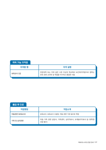 %uc9c1%uc5c5%uba85%uce6d %uc9c1%uc5c5%uc18c%uac1c%uc544%ub3d9%uad00%ub828 (%ubcf4%uc721%uad50%uc0ac) %ubcf4%uc721%uad50%uc0ac, %ubcf4%uc721%uad50%uc0ac %uc2dc%uc124%uc7a5, %uc544%ub3d9 %uad00%ub828 %uae30%uad00 %ub4f1%uc73c%ub85c %ucde8%uc5c5%uac00%uc871 %ubc0f %uc2ec%ub9ac%uad00%ub828 %uc544%ub3d9%u00b7%uac00%uc871 %uad00%ub828 %uc0c1%ub2f4%uc0ac, %uac00%uc871%uc13c%ud130, %uc2ec%ub9ac%uce58%ub8cc%uc0ac, %ubaa8%ub798%ub180%uc774%uce58%ub8cc%uc0ac %ub4f1 (%ub300%ud559%uc6d0 %uacfc%uc815 %ud544%uc218)%uc878%uc5c5 %ud6c4 %uc9c4%ub85c%ucde8%ub4dd %uac00%ub2a5 %uc790%uaca9%uc99d%uc790%uaca9%uc99d %uba85 %uc790%uaca9 %uc124%uba85%ubcf4%uc721%uad50%uc0ac 2%uae09 %uc804%ubb38%ub300%ud559 %ub610%ub294 %uc774%uc640 %uac19%uc740 %uc218%uc900 %uc774%uc0c1%uc758 %ud559%uad50%uc5d0%uc11c %ubcf4%uac74%ubcf5%uc9c0%ubd80%ub839%uc73c%ub85c %uc815%ud558%ub294 %ubcf4%uc721 %uad00%ub828 %uad50%uacfc%ubaa9 %ubc0f %ud559%uc810%uc744 %uc774%uc218%ud558%uace0 %uc878%uc5c5%ud55c %uc0ac%ub78c%ud559%ubd80(%uacfc) %uc18c%uac1c %ubc0f %uc804%uacf5 %uc548%ub0b4 | 137