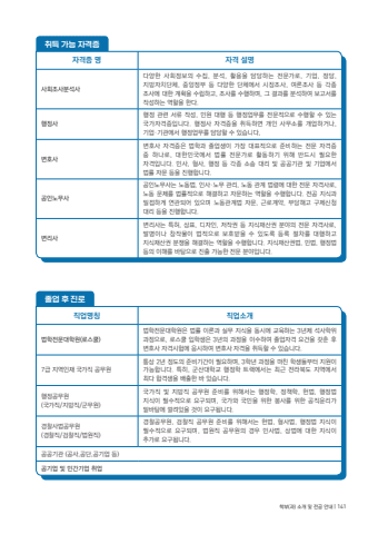 %uc9c1%uc5c5%uba85%uce6d %uc9c1%uc5c5%uc18c%uac1c%ubc95%ud559%uc804%ubb38%ub300%ud559%uc6d0(%ub85c%uc2a4%ucfe8)%ubc95%ud559%uc804%ubb38%ub300%ud559%uc6d0%uc740 %ubc95%ub960 %uc774%ub860%uacfc %uc2e4%ubb34 %uc9c0%uc2dd%uc744 %ub3d9%uc2dc%uc5d0 %uad50%uc721%ud558%ub294 3%ub144%uc81c %uc11d%uc0ac%ud559%uc704 %uacfc%uc815%uc73c%ub85c, %ub85c%uc2a4%ucfe8 %uc785%ud559%uc0dd%uc740 3%ub144%uc758 %uacfc%uc815%uc744 %uc774%uc218%ud558%uc5ec %uc878%uc5c5%uc790%uaca9 %uc694%uac74%uc744 %uac16%ucd98 %ud6c4 %ubcc0%ud638%uc0ac %uc790%uaca9%uc2dc%ud5d8%uc5d0 %uc751%uc2dc%ud558%uc5ec %ubcc0%ud638%uc0ac %uc790%uaca9%uc744 %ucde8%ub4dd%ud560 %uc218 %uc788%uc2b5%ub2c8%ub2e4.7%uae09 %uc9c0%uc5ed%uc778%uc7ac %uad6d%uac00%uc9c1 %uacf5%ubb34%uc6d0%ud1b5%uc0c1 2%ub144 %uc815%ub3c4%uc758 %uc900%ube44%uae30%uac04%uc774 %ud544%uc694%ud558%uba70, 3%ud559%ub144 %uacfc%uc815%uc744 %ub9c8%uce5c %ud559%uc0dd%ub4e4%ubd80%ud130 %uc9c0%uc6d0%uc774 %uac00%ub2a5%ud569%ub2c8%ub2e4. %ud2b9%ud788, %uad70%uc0b0%ub300%ud559%uad50 %ud589%uc815%ud559 %ud2b8%ub799%uc5d0%uc11c%ub294 %ucd5c%uadfc %uc804%ub77c%ubd81%ub3c4 %uc9c0%uc5ed%uc5d0%uc11c %ucd5c%ub2e4 %ud569%uaca9%uc0dd%uc744 %ubc30%ucd9c%ud55c %ubc14 %uc788%uc2b5%ub2c8%ub2e4.%ud589%uc815%uacf5%ubb34%uc6d0(%uad6d%uac00%uc9c1/%uc9c0%ubc29%uc9c1/%uad70%ubb34%uc6d0)%uad6d%uac00%uc9c1 %ubc0f %uc9c0%ubc29%uc9c1 %uacf5%ubb34%uc6d0 %uc900%ube44%ub97c %uc704%ud574%uc11c%ub294 %ud589%uc815%ud559, %uc815%ucc45%ud559, %ud5cc%ubc95, %ud589%uc815%ubc95 %uc9c0%uc2dd%uc774 %ud544%uc218%uc801%uc73c%ub85c %uc694%uad6c%ub418%uba70, %uad6d%uac00%uc640 %uad6d%ubbfc%uc744 %uc704%ud55c %ubd09%uc0ac%ub97c %uc704%ud55c %uacf5%uc9c1%uc724%ub9ac%uac00 %ubc11%ubc14%ud0d5%uc5d0 %uae54%ub824%uc788%uc744 %uac83%uc774 %uc694%uad6c%ub429%ub2c8%ub2e4.%uacbd%ucc30%uc0ac%ubc95%uacf5%ubb34%uc6d0(%uacbd%ucc30%uc9c1/%uac80%ucc30%uc9c1/%ubc95%uc6d0%uc9c1)%uacbd%ucc30%uacf5%ubb34%uc6d0, %uac80%ucc30%uc9c1 %uacf5%ubb34%uc6d0 %uc900%ube44%ub97c %uc704%ud574%uc11c%ub294 %ud5cc%ubc95, %ud615%uc0ac%ubc95, %ud589%uc815%ubc95 %uc9c0%uc2dd%uc774 %ud544%uc218%uc801%uc73c%ub85c %uc694%uad6c%ub418%uba70, %ubc95%uc6d0%uc9c1 %uacf5%ubb34%uc6d0%uc758 %uacbd%uc6b0 %ubbfc%uc0ac%ubc95, %uc0c1%ubc95%uc5d0 %ub300%ud55c %uc9c0%uc2dd%uc774 %ucd94%uac00%ub85c %uc694%uad6c%ub429%ub2c8%ub2e4.%uacf5%uacf5%uae30%uad00 (%uacf5%uc0ac,%uacf5%ub2e8,%uacf5%uae30%uc5c5 %ub4f1)%uacf5%uae30%uc5c5 %ubc0f %ubbfc%uac04%uae30%uc5c5 %ucde8%uc5c5%uc878%uc5c5 %ud6c4 %uc9c4%ub85c%ucde8%ub4dd %uac00%ub2a5 %uc790%uaca9%uc99d%uc790%uaca9%uc99d %uba85 %uc790%uaca9 %uc124%uba85%uc0ac%ud68c%uc870%uc0ac%ubd84%uc11d%uc0ac%ub2e4%uc591%ud55c %uc0ac%ud68c%uc815%ubcf4%uc758 %uc218%uc9d1, %ubd84%uc11d, %ud65c%uc6a9%uc744 %ub2f4%ub2f9%ud558%ub294 %uc804%ubb38%uac00%ub85c, %uae30%uc5c5, %uc815%ub2f9, %uc9c0%ubc29%uc790%uce58%ub2e8%uccb4, %uc911%uc559%uc815%ubd80 %ub4f1 %ub2e4%uc591%ud55c %ub2e8%uccb4%uc5d0%uc11c %uc2dc%uc7a5%uc870%uc0ac, %uc5ec%ub860%uc870%uc0ac %ub4f1 %uac01%uc885 %uc870%uc0ac%uc5d0 %ub300%ud55c %uacc4%ud68d%uc744 %uc218%ub9bd%ud558%uace0, %uc870%uc0ac%ub97c %uc218%ud589%ud558%uba70, %uadf8 %uacb0%uacfc%ub97c %ubd84%uc11d%ud558%uc5ec %ubcf4%uace0%uc11c%ub97c %uc791%uc131%ud558%ub294 %uc5ed%ud560%uc744 %ud55c%ub2e4.%ud589%uc815%uc0ac%ud589%uc815 %uad00%ub828 %uc11c%ub958 %uc791%uc131, %ubbfc%uc6d0 %ub300%ud589 %ub4f1 %ud589%uc815%uc5c5%ubb34%ub97c %uc804%ubb38%uc801%uc73c%ub85c %uc218%ud589%ud560 %uc218 %uc788%ub294 %uad6d%uac00%uc790%uaca9%uc99d%uc785%ub2c8%ub2e4. %ud589%uc815%uc0ac %uc790%uaca9%uc99d%uc744 %ucde8%ub4dd%ud558%uba74 %uac1c%uc778 %uc0ac%ubb34%uc18c%ub97c %uac1c%uc5c5%ud558%uac70%ub098, %uae30%uc5c5%u00b7%uae30%uad00%uc5d0%uc11c %ud589%uc815%uc5c5%ubb34%ub97c %ub2f4%ub2f9%ud560 %uc218 %uc788%uc2b5%ub2c8%ub2e4,%ubcc0%ud638%uc0ac%ubcc0%ud638%uc0ac %uc790%uaca9%uc99d%uc740 %ubc95%ud559%uacfc %uc878%uc5c5%uc0dd%uc774 %uac00%uc7a5 %ub300%ud45c%uc801%uc73c%ub85c %uc900%ube44%ud558%ub294 %uc804%ubb38 %uc790%uaca9%uc99d %uc911 %ud558%ub098%ub85c, %ub300%ud55c%ubbfc%uad6d%uc5d0%uc11c %ubc95%ub960 %uc804%ubb38%uac00%ub85c %ud65c%ub3d9%ud558%uae30 %uc704%ud574 %ubc18%ub4dc%uc2dc %ud544%uc694%ud55c %uc790%uaca9%uc785%ub2c8%ub2e4. %ubbfc%uc0ac, %ud615%uc0ac, %ud589%uc815 %ub4f1 %uac01%uc885 %uc18c%uc1a1 %ub300%ub9ac %ubc0f %uacf5%uacf5%uae30%uad00 %ubc0f %uae30%uc5c5%uc5d0%uc11c %ubc95%ub960 %uc790%ubb38 %ub4f1%uc744 %uc9c4%ud589%ud569%ub2c8%ub2e4.%uacf5%uc778%ub178%ubb34%uc0ac%uacf5%uc778%ub178%ubb34%uc0ac%ub294 %ub178%ub3d9%ubc95, %uc778%uc0ac%u00b7%ub178%ubb34 %uad00%ub9ac, %ub178%ub3d9 %uad00%uacc4 %ubc95%ub839%uc5d0 %ub300%ud55c %uc804%ubb38 %uc790%uaca9%uc0ac%ub85c, %ub178%ub3d9 %ubb38%uc81c%ub97c %ubc95%ub960%uc801%uc73c%ub85c %ud574%uacb0%ud558%uace0 %uc790%ubb38%ud558%ub294 %uc5ed%ud560%uc744 %uc218%ud589%ud569%ub2c8%ub2e4. %uc804%uacf5 %uc9c0%uc2dd%uacfc %ubc00%uc811%ud558%uac8c %uc5f0%uad00%ub418%uc5b4 %uc788%uc73c%uba70 %ub178%ub3d9%uad00%uacc4%ubc95 %uc790%ubb38, %uadfc%ub85c%uacc4%uc57d, %ubd80%ub2f9%ud574%uace0 %uad6c%uc81c%uc2e0%uccad %ub300%ub9ac %ub4f1%uc744 %uc9c4%ud589%ud569%ub2c8%ub2e4.%ubcc0%ub9ac%uc0ac%ubcc0%ub9ac%uc0ac%ub294 %ud2b9%ud5c8, %uc0c1%ud45c, %ub514%uc790%uc778, %uc800%uc791%uad8c %ub4f1 %uc9c0%uc2dd%uc7ac%uc0b0%uad8c %ubd84%uc57c%uc758 %uc804%ubb38 %uc790%uaca9%uc0ac%ub85c, %ubc1c%uba85%uc774%ub098 %ucc3d%uc791%ubb3c%uc774 %ubc95%uc801%uc73c%ub85c %ubcf4%ud638%ubc1b%uc744 %uc218 %uc788%ub3c4%ub85d %ub4f1%ub85d %uc808%ucc28%ub97c %ub300%ud589%ud558%uace0 %uc9c0%uc2dd%uc7ac%uc0b0%uad8c %ubd84%uc7c1%uc744 %ud574%uacb0%ud558%ub294 %uc5ed%ud560%uc744 %uc218%ud589%ud569%ub2c8%ub2e4. %uc9c0%uc2dd%uc7ac%uc0b0%uad8c%ubc95, %ubbfc%ubc95, %ud589%uc815%ubc95 %ub4f1%uc758 %uc774%ud574%ub97c %ubc14%ud0d5%uc73c%ub85c %uc9c4%ucd9c %uac00%ub2a5%ud55c %uc804%ubb38 %ubd84%uc57c%uc785%ub2c8%ub2e4.%ud559%ubd80(%uacfc) %uc18c%uac1c %ubc0f %uc804%uacf5 %uc548%ub0b4 | 141