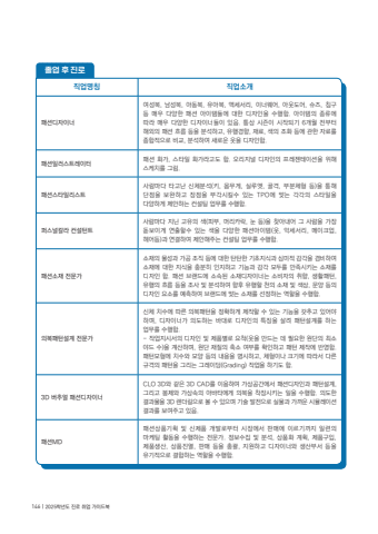 %uc9c1%uc5c5%uba85%uce6d %uc9c1%uc5c5%uc18c%uac1c%ud328%uc158%ub514%uc790%uc774%ub108%uc5ec%uc131%ubcf5, %ub0a8%uc131%ubcf5, %uc544%ub3d9%ubcf5, %uc720%uc544%ubcf5, %uc561%uc138%uc11c%ub9ac, %uc774%ub108%uc6e8%uc5b4, %uc544%uc6c3%ub3c4%uc5b4, %uc288%uc988, %uce68%uad6c %ub4f1 %ub9e4%uc6b0 %ub2e4%uc591%ud55c %ud328%uc158 %uc544%uc774%ud15c%ub4e4%uc5d0 %ub300%ud55c %ub514%uc790%uc778%uc744 %uc218%ud589%ud568. %uc544%uc774%ud15c%uc758 %uc885%ub958%uc5d0 %ub530%ub77c %ub9e4%uc6b0 %ub2e4%uc591%ud55c %ub514%uc790%uc774%ub108%ub4e4%uc774 %uc788%uc74c. %ud1b5%uc0c1 %uc2dc%uc98c%uc774 %uc2dc%uc791%ub418%uae30 6%uac1c%uc6d4 %uc804%ubd80%ud130 %ud574%uc678%uc758 %ud328%uc158 %ud750%ub984 %ub4f1%uc744 %ubd84%uc11d%ud558%uace0, %uc720%ud589%uacbd%ud5a5, %uc7ac%ub8cc, %uc0c9%uc758 %uc870%ud654 %ub4f1%uc5d0 %uad00%ud55c %uc790%ub8cc%ub97c %uc885%ud569%uc801%uc73c%ub85c %ube44%uad50, %ubd84%uc11d%ud558%uc5ec %uc0c8%ub85c%uc6b4 %uc637%uc744 %ub514%uc790%uc778%ud568.%ud328%uc158%uc77c%ub7ec%uc2a4%ud2b8%ub808%uc774%ud130 %ud328%uc158 %ud654%uac00, %uc2a4%ud0c0%uc77c %ud654%uac00%ub77c%uace0%ub3c4 %ud568. %uc624%ub9ac%uc9c0%ub110 %ub514%uc790%uc778%uc758 %ud504%ub808%uc820%ud14c%uc774%uc158%uc744 %uc704%ud574 %uc2a4%ucf00%uce58%ub97c %uadf8%ub9bc. %ud328%uc158%uc2a4%ud0c0%uc77c%ub9ac%uc2a4%ud2b8%uc0ac%ub78c%ub9c8%ub2e4 %ud0c0%uace0%ub09c %uc2e0%uccb4%ubd84%uc11d(%ud0a4, %ubab8%ubb34%uac8c, %uc2e4%ub8e8%uc5e3, %uace8%uaca9, %ubd80%ubd84%uccb4%ud615 %ub4f1)%uc744 %ud1b5%ud574 %ub2e8%uc810%uc744 %ubcf4%uc644%ud558%uace0 %uc7a5%uc810%uc744 %ubd80%uac01%uc2dc%ud0ac%uc218 %uc788%ub294 TPO%uc5d0 %ub9de%ub294 %uac01%uac01%uc758 %uc2a4%ud0c0%uc77c%uc744 %ub2e4%uc591%ud558%uac8c %uc81c%uc548%ud558%ub294 %ucee8%uc124%ud305 %uc5c5%ubb34%ub97c %uc218%ud589%ud568.%ud37c%uc2a4%ub110%uce7c%ub77c %ucee8%uc124%ud134%ud2b8%uc0ac%ub78c%ub9c8%ub2e4 %uc9c0%ub2cc %uace0%uc720%uc758 %uc0c9(%ud53c%ubd80, %uba38%ub9ac%uce74%ub77d, %ub208 %ub4f1)%uc744 %ucc3e%uc544%ub0b4%uc5b4 %uadf8 %uc0ac%ub78c%uc744 %uac00%uc7a5 %ub3cb%ubcf4%uc774%uac8c %uc5f0%ucd9c%ud560%uc218 %uc788%ub294 %uc0c9%uc744 %ub2e4%uc591%ud55c %ud328%uc158%uc544%uc774%ud15c(%uc637, %uc545%uc138%uc11c%ub9ac, %uba54%uc774%ud06c%uc5c5, %ud5e4%uc5b4%ub4f1)%uacfc %uc5f0%uacb0%ud558%uc5ec %uc81c%uc548%ud574%uc8fc%ub294 %ucee8%uc124%ud305 %uc5c5%ubb34%ub97c %uc218%ud589%ud568.%ud328%uc158%uc18c%uc7ac %uc804%ubb38%uac00%uc18c%uc7ac%uc758 %ubb3c%uc131%uacfc %uac00%uacf5 %uc870%uc9c1 %ub4f1%uc5d0 %ub300%ud55c %ud0c4%ud0c4%ud55c %uae30%ucd08%uc9c0%uc2dd%uacfc %uc2ec%ubbf8%uc801 %uac10%uac01%uc744 %uacb8%ube44%ud558%uc5ec %uc18c%uc7ac%uc5d0 %ub300%ud55c %uc9c0%uc2dd%uc744 %ucda9%ubd84%ud788 %uc778%uc9c0%ud558%uace0 %uae30%ub2a5%uacfc %uac10%uac01 %ubaa8%ub450%ub97c %ub9cc%uc871%uc2dc%ud0a4%ub294 %uc18c%uc7ac%ub97c %ub514%uc790%uc778 %ud568. %ud328%uc158 %ube0c%ub79c%ub4dc%uc5d0 %uc18c%uc18d%ub41c %uc18c%uc7ac%ub514%uc790%uc774%ub108%ub294 %uc18c%ube44%uc790%uc758 %ucde8%ud5a5, %uc0dd%ud65c%ud328%ud134, %uc720%ud589%uc758 %ud750%ub984 %ub4f1%uc744 %uc870%uc0ac %ubc0f %ubd84%uc11d%ud558%uc5ec %ud5a5%ud6c4 %uc720%ud589%ud560 %ucc9c%uc758 %uc18c%uc7ac %ubc0f %uc0c9%uc0c1, %ubb38%uc591 %ub4f1%uc758 %ub514%uc790%uc778 %uc694%uc18c%ub97c %uc608%uce21%ud558%uc5ec %ube0c%ub79c%ub4dc%uc5d0 %ub9de%ub294 %uc18c%uc7ac%ub97c %uc120%uc815%ud558%ub294 %uc5ed%ud560%uc744 %uc218%ud589%ud568. %uc758%ubcf5%ud328%ud134%uc124%uacc4 %uc804%ubb38%uac00%uc2e0%uccb4 %uce58%uc218%uc5d0 %ub530%ub978 %uc758%ubcf5%ud328%ud134%uc744 %uc815%ud655%ud558%uac8c %uc81c%uc791%ud560 %uc218 %uc788%ub294 %uae30%ub2a5%uc744 %uac16%ucd94%uace0 %uc788%uc5b4%uc57c %ud558%uba70, %ub514%uc790%uc774%ub108%uac00 %uc758%ub3c4%ud558%ub294 %ubc14%ub300%ub85c %ub514%uc790%uc778%uc758 %ud2b9%uc9d5%uc744 %uc0b4%ub824 %ud328%ud134%uc124%uacc4%ub97c %ud558%ub294 %uc5c5%ubb34%ub97c %uc218%ud589%ud568.- %uc791%uc5c5%uc9c0%uc2dc%uc11c%uc758 %ub514%uc790%uc778 %ubc0f %uc81c%ud488%ubcc4%ub85c %uc694%ucc99(%uc637%uc744 %ub9cc%ub4dc%ub294 %ub370 %ud544%uc694%ud55c %uc6d0%ub2e8%uc758 %ucd5c%uc18c %uc57c%ub4dc %uc218)%uc744 %uacc4%uc0b0%ud558%uba70, %uc6d0%ub2e8 %uc7ac%uc9c8%uc758 %ucd95%uc18c %uc5ec%ubd80%ub97c %ud655%uc778%ud558%uace0 %ud328%ud134 %uc81c%uc791%uc5d0 %ubc18%uc601%ud568. %ud328%ud134%ubaa8%ud615%uc5d0 %uce58%uc218%uc640 %ubaa8%uc591 %ub4f1%uc758 %ub0b4%uc6a9%uc744 %uba85%uc2dc%ud558%uace0, %uccb4%ud615%uc774%ub098 %ud06c%uae30%uc5d0 %ub530%ub77c%uc11c %ub2e4%ub978 %uaddc%uaca9%uc758 %ud328%ud134%uc744 %uadf8%ub9ac%ub294 %uadf8%ub808%uc774%ub529(Grading) %uc791%uc5c5%uc744 %ud558%uae30%ub3c4 %ud568. 3D %ubc84%ucd94%uc5bc %ud328%uc158%ub514%uc790%uc774%ub108CLO 3D%uc640 %uac19%uc740 3D CAD%ub97c %uc774%uc6a9%ud558%uc5ec %uac00%uc0c1%uacf5%uac04%uc5d0%uc11c %ud328%uc158%ub514%uc790%uc778%uacfc %ud328%ud134%uc124%uacc4, %uadf8%ub9ac%uace0 %ubd09%uc81c%uc640 %uac00%uc0c1%uc18d%uc758 %uc544%ubc14%ud0c0%uc5d0%uac8c %uc758%ubcf5%uc744 %ucc29%uc7a5%uc2dc%ud0a4%ub294 %uc77c%uc744 %uc218%ud589%ud568. %uc758%ub3c4%ud55c %uacb0%uacfc%ubb3c%uc744 3D %ub80c%ub354%ub9c1%uc73c%ub85c %ubcfc %uc218 %uc788%uc73c%uba70 %uae30%uc220 %ubc1c%uc804%uc73c%ub85c %uc2e4%ubb3c%uacfc %uac00%uae4c%uc6b4 %uc2dc%ubbac%ub808%uc774%uc158 %uacb0%uacfc%ub97c %ubcf4%uc5ec%uc8fc%uace0 %uc788%uc74c. %ud328%uc158MD%ud328%uc158%uc0c1%ud488%uae30%ud68d %ubc0f %uc2e0%uc81c%ud488 %uac1c%ubc1c%ub85c%ubd80%ud130 %uc2dc%uc7a5%uc5d0%uc11c %ud310%ub9e4%uc5d0 %uc774%ub974%uae30%uae4c%uc9c0 %uc77c%ub828%uc758 %ub9c8%ucf00%ud305 %ud65c%ub3d9%uc744 %uc218%ud589%ud558%ub294 %uc804%ubb38%uac00. %uc815%ubcf4%uc218%uc9d1 %ubc0f %ubd84%uc11d, %uc0c1%ud488%ud654 %uacc4%ud68d, %uc81c%ud488%uad6c%uc785, %uc81c%ud488%uc0dd%uc0b0, %uc0c1%ud488%uc9c4%uc5f4, %ud310%ub9e4 %ub4f1%uc744 %ucd1d%uad04, %uc9c0%uc6d0%ud558%uace0 %ub514%uc790%uc774%ub108%uc640 %uc0dd%uc0b0%ubd80%uc11c %ub4f1%uc744 %uc720%uae30%uc801%uc73c%ub85c %uacb0%ud569%ud558%ub294 %uc5ed%ud560%uc744 %uc218%ud589%ud568.%uc878%uc5c5 %ud6c4 %uc9c4%ub85c146 | 2025%ud559%ub144%ub3c4 %uc9c4%ub85c %ucde8%uc5c5 %uac00%uc774%ub4dc%ubd81