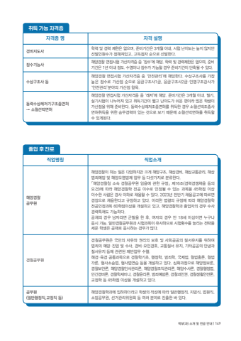 %uc9c1%uc5c5%uba85%uce6d %uc9c1%uc5c5%uc18c%uac1c%ud574%uc591%uacbd%ucc30%uacf5%ubb34%uc6d0%ud574%uc591%uacbd%ucc30%uc774 %ud558%ub294 %uc77c%uc740 %ub2e4%uc591%ud558%uc9c0%ub9cc %ud06c%uac8c %ud574%uc591%uad6c%uc870, %ud574%uc0c1%uacbd%ube44, %ud574%uc0c1%uad50%ud1b5%uad00%ub9ac, %ud574%uc0c1%ubc94%uc8c4%uc608%ubc29 %ubc0f %ud574%uc591%uc624%uc5fc%ubc29%uc81c %uc5c5%ubb34 %ub4f1 %ub2e4%uc12f%uac00%uc9c0%ub85c %ubd84%ub958%ud55c%ub2e4.%u300c%ud574%uc591%uacbd%ucc30%uccad %uc18c%uc18d %uacbd%ucc30%uacf5%ubb34%uc6d0 %uc784%uc6a9%uc5d0 %uad00%ud55c %uaddc%uc815%u300d %uc81c16%uc870(%uacbd%ub825%uacbd%uc7c1%ucc44%uc6a9 %ub4f1%uc758 %uc694%uac74)%uc5d0 %ub530%ub77c %ud574%uc591%uacbd%ucc30%ud559 %uc804%uacf5 %uc774%uc218%ub85c %uc778%uc815%ub420 %uc218 %uc788%ub294 %uacfc%ubaa9%uc744 45%ud559%uc810 %uc774%uc0c1 %uc774%uc218%ud55c %uc0ac%ub78c%uc740 %uacbd%uc0ac %uc774%ud558%ub85c %ucc44%uc6a9%ud560 %uc218 %uc788%ub2e4. 2023%ub144 %uc804%ubc18%uae30 %ucc44%uc6a9%uacf5%uace0%uc5d0 %ub530%ub974%uba74 %uacbd%uc7a5%uc73c%ub85c %ucc44%uc6a9%ud55c%ub2e4%uace0 %uaddc%uc815%ud558%uace0 %uc788%ub2e4. %uc774%ub7ec%ud55c %ubc95%ub839%uc758 %uaddc%uc815%uc5d0 %ub530%ub77c %ud574%uc591%uacbd%ucc30%ud559 %uc804%uacf5%uc778%uc815%uacfc%ubaa9 60%ud559%uc810%uc774%uc0c1%uc744 %uac1c%uc124%ud558%uace0 %uc788%uace0, %ud574%uc591%uacbd%ucc30%ud559%uacfc %uc878%uc5c5%uc790%uc758 %uacbd%uc6b0 %uc218%uc0ac%uacbd%ub825%ud2b9%ucc44%ub3c4 %uac00%ub2a5%ud558%ub2e4.%uacf5%ucc44%uc758 %uacbd%uc6b0 %ub0a8%uc790%ub77c%uba74 %uad70%ud544%uc744 %ud55c %ud6c4, %uc5ec%uc790%uc758 %uacbd%uc6b0 %ub9cc 18%uc138 %uc774%uc0c1%uc774%uba74 %ub204%uad6c%ub098 %uc751%uc2dc %uac00%ub2a5. %uc77c%ubc18%uacbd%ucc30%uacf5%ubb34%uc6d0%uacfc %uc2dc%ud5d8%uacfc%ubaa9%uc774 %uc720%uc0ac%ud558%ubbc0%ub85c %uc2dc%ud5d8%ud69f%uc218%ub97c %ub298%ub9ac%ub294 %uc804%ub7b5%uc744 %uc138%uc6b4 %ud559%uc0dd%uc740 %uacf5%ucc44%ub85c %uc751%uc2dc%ud558%ub294 %uacbd%uc6b0%uac00 %ub9ce%ub2e4.%uacbd%ucc30%uacf5%ubb34%uc6d0%uacbd%ucc30%uacf5%ubb34%uc6d0%uc740 %uad6d%ubbfc%uc758 %uc790%uc720%uc640 %uad8c%ub9ac%uc758 %ubcf4%ud638 %ubc0f %uc0ac%ud68c%uacf5%uacf5%uc758 %uc9c8%uc11c%uc720%uc9c0%ub97c %uc704%ud558%uc5ec %ubc94%uc8c4%uc758 %uc608%ubc29%u00b7%uc9c4%uc555 %ubc0f %uc218%uc0ac, %uacbd%ube44%u00b7%uc694%uc778%uacbd%ud638, %uad50%ud1b5%uc9c8%uc11c %uc720%uc9c0, %uae30%ud0c0%uacf5%uacf5%uc758 %uc548%ub155%uacfc %uc9c8%uc11c%uc720%uc9c0 %ub4f1%uc5d0 %uad00%ub828%ub41c %uc81c%ubc18%uc5c5%ubb34 %uc218%ud589.%ud574%uacbd%u00b7%uc721%uacbd %uacf5%ud1b5%uacfc%ubaa9%uc73c%ub85c %uacbd%ucc30%ud559%uae30%ucd08, %ud589%uc815%ud559, %ubc94%uc8c4%ud559, %uad6d%uc81c%ubc95, %ud615%ubc95%ucd1d%ub860, %ud615%ubc95%uac01%ub860, %ud615%uc0ac%uc18c%uc1a1%ubc95, %ud615%uc0ac%ubc95%uc5f0%uc2b5 %ub4f1%uc744 %uac1c%uc124%ud558%uace0 %uc788%ub2e4. %uc2ec%ud654%uacfc%uc815%uc73c%ub85c %ud574%uc591%uc815%ubcf4%ub860, %uacbd%ucc30%ubcf4%uc548%ub860, %ud574%uc591%uacbd%ucc30%uc778%uc0ac%uad00%ub9ac%ub860, %ud574%uc591%uacbd%ucc30%uc870%uc9c1%uad00%ub9ac%ub860, %ud574%uc591%uc218%uc0ac%ub860, %uacbd%ucc30%ud589%uc815%ubc95, %ubbfc%uac04%uacbd%ube44%ub860, %uacbd%ucc30%ud559%uc138%ubbf8%ub098, %uacbd%ucc30%uc724%ub9ac%ub860, %ubc94%uc8c4%uc608%ubc29%ub860, %uacbd%ucc30%uacfc%uc778%uad8c, %uacbd%ucc30%uc0dd%ud65c%uc548%uc804%ub860, %uad50%uc815%ud559 %ub4f1 45%ud559%uc810 %uc774%uc0c1%uc744 %uac1c%uc124%ud558%uace0 %uc788%ub2e4.%uacf5%ubb34%uc6d0(%uc77c%ubc18%ud589%uc815%uc9c1,%uad50%uc815%uc9c1 %ub4f1)%ud574%uc591%uacbd%ucc30%ud559%uacfc%uc5d0 %uc785%ud558%ud558%ub354%ub77c%uace0 %ud559%uc0dd%uc758 %uc801%uc131%uc5d0 %ub530%ub77c %uc77c%ubc18%ud589%uc815%uc9c1, %uc9c0%ubc29%uc2dd, %ubc95%uc6d0%uc9c1, %uc18c%ubc29%uacf5%ubb34%uc6d0, %uc120%uac70%uad00%ub9ac%uc704%uc6d0%ud68c %ub4f1 %uc5ec%ub7ec %ubd84%uc57c%ub85c %uc9c4%ucd9c%ud55c %ubc14 %uc788%ub2e4.%uc878%uc5c5 %ud6c4 %uc9c4%ub85c%ucde8%ub4dd %uac00%ub2a5 %uc790%uaca9%uc99d%uc790%uaca9%uc99d %uba85 %uc790%uaca9 %uc124%uba85%uacbd%ube44%uc9c0%ub3c4%uc0ac %ud559%ub825 %ubc0f %uacbd%ub825 %uc81c%ud55c%uc740 %uc5c6%uc73c%uba70, %uc900%ube44%uae30%uac04%uc740 3%uac1c%uc6d4 %uc774%ub0b4, %uc2dc%ud5d8 %ub09c%uc774%ub3c4%ub294 %ub192%uc9c0 %uc54a%uc9c0%ub9cc %uc120%ubc1c%uc778%uc6d0%uc218%uac00 %uc815%ud574%uc838%uc788%uace0, %uace0%ub4dd%uc810%uc790 %uc21c%uc73c%ub85c %uc120%ubc1c%ud55c%ub2e4.%uc7a0%uc218%uae30%ub2a5%uc0ac %ud574%uc591%uacbd%ucc30 %uba74%uc811%uc2dc%ud5d8 %uac00%uc0b0%uc790%uaca9%uc99d %uc911 %u2018%uc7a0%uc218%u2019%uc5d0 %ud574%ub2f9. %ud559%ub825 %ubc0f %uacbd%ub825%uc81c%ud55c%uc740 %uc5c6%uc73c%uba70, %uc900%ube44%uae30%uac04%uc740 1%ub144 %uc774%ub0b4 %uc815%ub3c4. %uc218%uc601%uc774%ub098 %uc7a0%uc218%uac00 %uac00%ub2a5%ud560 %uacbd%uc6b0 %uc900%ube44%uae30%uac04%uc774 %ub2e8%ucd95%ub420 %uc218 %uc788%ub2e4.%uc218%uc0c1%uad6c%uc870%uc0ac %ub4f1%ud574%uc591%uacbd%ucc30 %uba74%uc811%uc2dc%ud5d8 %uac00%uc0b0%uc790%uaca9%uc99d %uc911 %u2018%uc548%uc804%uad00%ub9ac%u2019%uc5d0 %ud574%ub2f9%ud55c%ub2e4. %uc218%uc0c1%uad6c%uc870%uc0ac%ub97c %uac00%uc7a5 %ub192%uc740 %uc810%uc218%ub85c %uac00%uc0b0%uc810 %uc21c%uc73c%ub85c %uc751%uae09%uad6c%uc870%uc0ac1%uae09, %uc751%uae09%uad6c%uc870%uc0ac2%uae09%u00b7%uc778%uba85%uad6c%uc870%uac15%uc0ac%uac00 %u2018%uc548%uc804%uad00%ub9ac%u2019%ubd84%uc57c%uc758 %uac00%uc0b0%uc810 %ud56d%ubaa9.%ub3d9%ub825%uc218%uc0c1%ub808%uc800%uae30%uad6c%uc870%uc885%uba74%ud5c8%u2192 %uc18c%ud615%uc120%ubc15%uba74%ud5c8%ud574%uc591%uacbd%ucc30 %uba74%uc811%uc2dc%ud5d8 %uac00%uc0b0%uc790%uaca9%uc99d %uc911 %u2018%ub808%uc800%u2019%uc5d0 %ud574%ub2f9. %uc900%ube44%uae30%uac04%uc740 3%uac1c%uc6d4 %uc774%ub0b4. %ud544%uae30, %uc2e4%uae30%uc2dc%ud5d8%uc774 %ub098%ub204%uc5b4%uc838 %uc788%uace0 %ucde8%ub4dd%uae30%uac04%uc774 %uc9e7%uace0 %ub09c%uc774%ub3c4%uac00 %uc26c%uc6b4 %ud3b8%uc774%ub77c %ub9ce%uc740 %ud559%uc0dd%uc774%uac00%uc0b0%uc810%uc744 %uc704%ud574 %uc900%ube44%ud55c%ub2e4. %ub3d9%ub825%uc218%uc0c1%ub808%uc800%uc870%uc885%uba74%ud5c8%ub97c %ucde8%ub4dd%ud55c %uacbd%uc6b0 %uc18c%ud615%uc120%ubc1