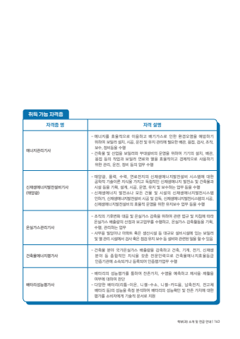%ucde8%ub4dd %uac00%ub2a5 %uc790%uaca9%uc99d%uc790%uaca9%uc99d %uba85 %uc790%uaca9 %uc124%uba85%uc5d0%ub108%uc9c0%uad00%ub9ac%uae30%uc0ac- %uc5d0%ub108%uc9c0%ub97c %ud6a8%uc728%uc801%uc73c%ub85c %uc774%uc6a9%ud558%uace0 %ubc30%uae30%uac00%uc2a4%ub85c %uc778%ud55c %ud658%uacbd%uc624%uc5fc%uc744 %uc608%ubc29%ud558%uae30 %uc704%ud558%uc5ec %ubcf4%uc77c%ub7ec %uc124%uce58, %uc2dc%uacf5, %uc6b4%uc804 %ubc0f %uc720%uc9c0 %uad00%ub9ac%uc5d0 %ud544%uc694%ud55c %ubc30%uad00, %uc6a9%uc811, %uac80%uc0ac, %uc870%uc791, %ubcf4%uc218, %uc815%ube44%ub4f1%uc744 %uc218%ud589- %uac74%ucd95%ubb3c %ubc0f %uc0b0%uc5c5%uc6a9 %ubcf4%uc77c%ub7ec%uc640 %ubd80%ub300%uc124%ube44%uc758 %uc6b4%uc601%uc744 %uc704%ud558%uc5ec %uae30%uae30%uc758 %uc124%uce58, %ubc30%uad00, %uc6a9%uc811 %ub4f1%uc758 %uc791%uc5c5%uacfc %ubcf4%uc77c%ub7ec %uc5f0%ub8cc%uc640 %uc5f4%uc744 %ud6a8%uc728%uc801%uc774%uace0 %uacbd%uc81c%uc801%uc73c%ub85c %uc0ac%uc6a9%ud558%uae30 %uc704%ud55c %uad00%ub9ac, %uc6b4%uc804, %uc815%ube44 %ub4f1%uc758 %uc5c5%ubb34 %uc218%ud589%uc2e0%uc7ac%uc0dd%uc5d0%ub108%uc9c0%ubc1c%uc804%uc124%ube44%uae30%uc0ac(%ud0dc%uc591%uad11)- %ud0dc%uc591%uad11, %ud48d%ub825, %uc218%ub825, %uc5f0%ub8cc%uc804%uc9c0%uc758 %uc2e0%uc7ac%uc0dd%uc5d0%ub108%uc9c0%ubc1c%uc804%uc124%ube44 %uc2dc%uc2a4%ud15c%uc5d0 %ub300%ud55c %uacf5%ud559%uc801 %uae30%uc220%uc774%ub860 %uc9c0%uc2dd%uc744 %uac00%uc9c0%uace0 %ub3c5%ub9bd%uc801%uc778 %uc2e0%uc7ac%uc0dd%uc5d0%ub108%uc9c0 %ubc1c%uc804%uc18c %ubc0f %uac74%ucd95%ubb3c%uacfc %uc2dc%uc124 %ub4f1%uc744 %uae30%ud68d, %uc124%uacc4, %uc2dc%uacf5, %uc6b4%uc601, %uc720%uc9c0 %ubc0f %ubcf4%uc218%ud558%ub294 %uc5c5%ubb34 %ub4f1%uc744 %uc218%ud589- %uc2e0%uc7ac%uc0dd%uc5d0%ub108%uc9c0 %ubc1c%uc804%uc18c%ub098 %ubaa8%ub4e0 %uac74%ubb3c %ubc0f %uc2dc%uc124%uc758 %uc2e0%uc7ac%uc0dd%uc5d0%ub108%uc9c0%ubc1c%uc804%uc2dc%uc2a4%ud15c %uc778%ud5c8%uac00, %uc2e0%uc7ac%uc0dd%uc5d0%ub108%uc9c0%ubc1c%uc804%uc124%ube44 %uc2dc%uacf5 %ubc0f %uac10%ub3c5, %uc2e0%uc7ac%uc0dd%uc5d0%ub108%uc9c0%ubc1c%uc804%uc2dc%uc2a4%ud15c%uc758 %uc2dc%uacf5, %uc2e0%uc7ac%uc0dd%uc5d0%ub108%uc9c0%ubc1c%uc804%uc124%ube44%uc758 %ud6a8%uc728%uc801 %uc6b4%uc601%uc744 %uc704%ud55c %uc720%uc9c0%ubcf4%uc218 %uc5c5%ubb34 %ub4f1%uc744 %uc218%ud589%uc628%uc2e4%uac00%uc2a4%uad00%ub9ac%uae30%uc0ac- %uc870%uc9c1%uc758 %uae30%ud6c4%ubcc0%ud654 %ub300%uc751 %ubc0f %uc628%uc2e4%uac00%uc2a4 %uac10%ucd95%uc744 %uc704%ud558%uc5ec %uad00%ub828 %ubc95%uaddc %ubc0f %uc9c0%uce68%uc5d0 %ub530%ub77c %uc628%uc2e4%uac00%uc2a4 %ubc30%ucd9c%ub7c9%uc758 %uc0b0%uc815%uacfc %ubcf4%uace0%uc5c5%ubb34%ub97c %uc218%ud589%ud558%uace0, %uc628%uc2e4%uac00%uc2a4 %uac10%ucd95%ud65c%ub3d9%uc744 %uae30%ud68d, %uc218%ud589, %uad00%ub9ac%ud558%ub294 %uc5c5%ubb34- %uc0ac%ubb34%uc6a9 %ube4c%ub529%uc774%ub098 %uc544%ud30c%ud2b8 %ud639%uc740 %uc0dd%uc0b0%uc2dc%uc124 %ub4f1 %ub300%uaddc%ubaa8 %uc124%ube44%uc2dc%uc124%uc5d0 %uc788%ub294 %ubcf4%uc77c%ub7ec %ubc0f %uc5f4 %uad00%ub9ac %uc2dc%uc124%uc5d0%uc11c %uac80%uc0ac %ud639%uc740 %uc810%uac80 %uc720%uc9c0 %ubcf4%uc218 %ub4f1 %uc124%ube44%uc640 %uad00%ub828%ub41c %uc77c%uc744 %ud560 %uc218 %uc788%uc74c%uac74%ucd95%ubb3c%uc5d0%ub108%uc9c0%ud3c9%uac00%uc0ac- %uac74%ucd95%ubb3c %ubd84%uc57c %uad6d%uac00%uc628%uc2e4%uac00%uc2a4 %ubc30%ucd9c%ub7c9%uc744 %uac10%ucd95%ud558%uace0 %uac74%ucd95, %uae30%uacc4, %uc804%uae30, %uc2e0%uc7ac%uc0dd %ubd84%uc57c %ub4f1 %uc885%ud569%uc801%uc778 %uc9c0%uc2dd%uc744 %uac16%ucd98 %uc804%ubb38%uc778%ub825%uc73c%ub85c %uac74%ucd95%ubb3c%uc5d0%ub108%uc9c0%ud6a8%uc728%ub4f1%uae09 %uc778%uc99d%uae30%uad00%uc5d0 %uc18c%uc18d%ub418%uac70%ub098 %ub4f1%ub85d%ub418%uc5b4 %uc778%uc99d%ud3c9%uac00%uc5c5%ubb34 %uc218%ud589%ubc30%ud130%ub9ac%uc131%ub2a5%ud3c9%uac00%uc0ac- %ubc30%ud130%ub9ac%uc758 %uc131%ub2a5%ud3c9%uac00%ub97c %ud1b5%ud558%uc5ec %uc794%uc874%uac00%uce58, %uc218%uba85%uc744 %uc608%uce21%ud558%uace0 %uc7ac%uc0ac%uc6a9%u00b7%uc7ac%ud65c%uc6a9 %uc5ec%ubd80%uc5d0 %ub300%ud558%uc5ec %ud310%ub2e8- %ub2e4%uc591%ud55c %ubc30%ud130%ub9ac(%ub9ac%ud2ac-%uc774%uc628, %ub2c8%ucf08-%uc218%uc18c, %ub2c8%ucf08-%uce74%ub4dc%ubbb4, %ub0a9%ucd95%uc804%uc9c0, %uc804%uace0%uccb4 %ubc30%ud130%ub9ac %ub4f1)%uc758 %uc131%ub2a5%uc744 %uce21%uc815 %ubd84%uc11d%ud558%uc5ec %ubc30%ud130%ub9ac%uc758 %uc131%ub2a5%ud655%uc778 %ubc0f %uc794%uc874 %uac00%uce58%uc5d0 %ub300%ud55c %ud3c9%uac00%ub97c %uc18c%ube44%uc790%uc5d0%uac8c %uae30%uc220%uc801 %ubb38%uc11c%ub85c %uc9c0%uc6d0%ud559%ubd80(%uacfc) %uc18c%uac1c %ubc0f %uc804%uacf5 %uc548%ub0b4 | 163