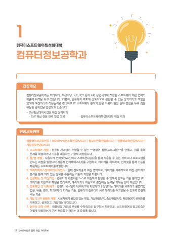 %ucef4%ud4e8%ud130%uc815%ubcf4%uacf5%ud559%uacfc1%uc804%uacf5%uac1c%uc694%ucef4%ud4e8%ud130%uc815%ubcf4%uacf5%ud559%uacfc%ub294 %ube45%ub370%uc774%ud130, %uba38%uc2e0%ub7ec%ub2dd, IoT, ICT %ub4f1%uc758 4%ucc28 %uc0b0%uc5c5%uc2dc%ub300%uc5d0 %uc801%ud569%ud55c %uc18c%ud504%ud2b8%uc6e8%uc5b4 %ud575%uc2ec %uc778%ub825%uc758 %ubc30%ucd9c%uc5d0 %ubaa9%uc801%uc744 %ub450%uace0 %uc788%uc2b5%ub2c8%ub2e4. %ub354%ubd88%uc5b4, %uc778%ub958%uc0ac%ud68c %ubcf5%uc9c0%uc5d0 %uc120%ub3c4%uc801%uc73c%ub85c %uacf5%ud5cc%ud560 %uc218 %uc788%ub294 %ucc3d%uc758%uc801%uc774%uace0 %ucc45%uc784%uac10 %uc788%uc73c%uba70 %ub3c4%uc804%uc758%uc2dd%uacfc %uc801%uc751%ub2a5%ub825%uc744 %uacb8%ube44%ud558%uace0 IT %uc18c%ud504%ud2b8%uc6e8%uc5b4 %ubd84%uc57c%uc758 %uc804%ubb38 %uc774%ub860%uacfc %ud604%uc7a5 %uc2e4%ubb34 %uacbd%ud5d8%uc744 %ub450%ub8e8 %uac16%ucd98 %uc720%ub2a5%ud55c %uacf5%ud559%uc778%uc744 %uc591%uc131%ud558%uace0 %uc788%uc2b5%ub2c8%ub2e4. - SW%uc911%uc2ec%ub300%ud559%uc0ac%uc5c5%ub2e8 %ud575%uc2ec %ucc38%uc5ec%ud559%uacfc %u00b7 SW %ud575%uc2ec %uc804%ubb38 %uc778%ub825 %uc591%uc131 %uad50%uc721 %u00b7 %ucef4%ud4e8%ud130%uc18c%ud504%ud2b8%uc6e8%uc5b4%ud2b9%uc131%ud654%ub300%ud559 %ud575%uc2ec %ud559%uacfc %ucef4%ud4e8%ud130%uc18c%ud504%ud2b8%uc6e8%uc5b4%ud2b9%uc131%ud654%ub300%ud559%ucef4%ud4e8%ud130%uc815%ubcf4%uacf5%ud559%uc804%uacf5 | %ub370%uc774%ud130%uc0ac%uc774%uc5b8%uc2a4%ud559%uc804%uacf5(MCD) | %uc815%ubcf4%ubcf4%uc548%ud559%uc804%uacf5(MCD) | %ucef4%ud4e8%ud130%uacfc%ud559%uc804%uacf5(MCD) | %uac8c%uc784%uacf5%ud559%uc804%uacf5(MCD)1. %uc18c%ud504%ud2b8%uc6e8%uc5b4 %uac1c%ubc1c : %ucef4%ud4e8%ud130 %uc2dc%uc2a4%ud15c%uc774 %uc218%ud589%ud560 %uc218 %uc788%ub294 **%uba85%ub839%uc5b4 %uc9d1%ud569(%ud504%ub85c%uadf8%ub7a8)**%uc744 %ub9cc%ub4e4%uace0, %uc774%ub97c %ud1b5%ud574 %ubb38%uc81c%ub97c %ud574%uacb0%ud558%uac70%ub098 %uae30%ub2a5%uc744 %uc81c%uacf5%ud558%ub294 %uae30%uc220%uc801 %uacfc%uc815%uc785%ub2c8%ub2e4.2. %uc6f9/%uc571 %uac1c%ubc1c : %uc0ac%uc6a9%uc790%uac00 %uc778%ud130%ub137(Web)%uc774%ub098 %uc2a4%ub9c8%ud2b8%ud3f0(App)%uc744 %ud1b5%ud574 %uc0ac%uc6a9%ud560 %uc218 %uc788%ub294 %uc11c%ube44%uc2a4%ub098 %ud504%ub85c%uadf8%ub7a8%uc744 %ub9cc%ub4dc%ub294 %uacfc%uc815%uc744 %ub9d0%ud569%ub2c8%ub2e4.%uc0ac%uc6a9%uc790 %uc778%ud130%ud398%uc774%uc2a4(UI)%ub97c %uad6c%ud604%ud558%uace0, %ub370%uc774%ud130%ub97c %ucc98%ub9ac%ud558%uba70, %uc778%ud130%ub137%uc744 %ud1b5%ud574 %uae30%ub2a5%uc744 %uc81c%uacf5%ud558%ub294 %uc18c%ud504%ud2b8%uc6e8%uc5b4%ub97c%uac1c%ubc1c%ud569%ub2c8%ub2e4.3. %ub370%uc774%ud130%ubca0%uc774%uc2a4%ubc0f%ub370%uc774%ud130%uc0ac%uc774%uc5b8%uc2a4 : %ud604%ub300 %uc815%ubcf4%uae30%uc220%uc758 %ud575%uc2ec %uc601%uc5ed%uc73c%ub85c, %ub370%uc774%ud130%ub97c %uccb4%uacc4%uc801%uc73c%ub85c %uc800%uc7a5%u00b7%uad00%ub9ac%ud558%uace0 %ubd84%uc11d%uc744 %ud1b5%ud574 %uc758%ubbf8 %uc788%ub294 %uc815%ubcf4%ub97c %ucd94%ucd9c%ud558%ub294 %uae30%uc220%uacfc %uacfc%uc815%uc744 %ub2e4%ub8f9%ub2c8%ub2e4.4. %uc778%uacf5%uc9c0%ub2a5 %ubc0f %uba38%uc2e0%ub7ec%ub2dd : %ucef4%ud4e8%ud130%uac00 %uc0ac%ub78c%ucc98%ub7fc %uc2a4%uc2a4%ub85c %ud559%uc2b5%ud558%uace0 %ud310%ub2e8%ud560 %uc218 %uc788%ub3c4%ub85d %ub9cc%ub4dc%ub294 %uae30%uc220 %ubd84%uc57c%uc785%ub2c8%ub2e4. %ub370%uc774%ud130%ub97c %uae30%ubc18%uc73c%ub85c %ud328%ud134%uc744 %uc778%uc2dd%ud558%uace0, %uc608%uce21%ud558%uac70%ub098 %uc790%ub3d9%uc73c%ub85c %uacb0%uc815%ud558%ub294 %ub2a5%ub825%uc744 %ud0a4%uc6b0%ub294 %uac83%uc774 %ud575%uc2ec%uc785%ub2c8%ub2e4.5. %uc815%ubcf4%ubcf4%uc548 %ubc0f %ub124%ud2b8%uc6cc%ud06c : %ucef4%ud4e8%ud130 %uc2dc%uc2a4%ud15c%uacfc %ub124%ud2b8%uc6cc%ud06c%uc5d0 %uc800%uc7a5%ub418%uac70%ub098 %uc804%ub2ec%ub418%ub294 %ub370%uc774%ud130%ub97c %ubcf4%ud638%ud558%uace0 %ubd88%ubc95%uc801%uc778 %uc811%uadfc, %uc720%ucd9c, %ubcc0%uc870, %ud30c%uad34%ub85c%ubd80%ud130 %uc9c0%ud0a4%ub294 %uae30%uc220. %ucef4%ud4e8%ud130%uc640 %ucef4%ud4e8%ud130%uac00 %uc11c%ub85c %ub370%uc774%ud130%ub97c %uc8fc%uace0%ubc1b%uc744 %uc218 %uc788%ub3c4%ub85d %uc5f0%uacb0%ud574 %uc8fc%ub294 %uae30%uc2206. %uac8c%uc784 %ubc0f XR %ucf58%ud150%uce20 %uac1c%ubc1c : %uc0ac%uc6a9%uc790%uc5d0%uac8c %ubab0%uc785%uac10 %uc788%ub294 %uac8c%uc784, %uac00%uc0c1%ud604%uc2e4(VR), %uc99d%uac15%ud604%uc2e4(AR), %ud655%uc7a5%ud604(XR) %ucf58%ud150%uce20%ub97c %uae30%ud68d%ud558%uace0, %uc124%uacc4%ud558%uace0, %uac1c%ubc1c%ud558%ub294 %ubd84%uc57c%uc785%ub2c8%ub2e4.7. %ucef4%ud4e8%ud130 %uacfc%ud559 %uc774%ub860 : %ucef4%ud4e8%ud130%uc640 %uacc4%uc0b0%uc758 %ubcf8%uc9c8%uc744 %uc218%ud559%uc801%uc73c%ub85c %ud0d0%uad6c%ud558%ub294 %ud559%ubb38%uc73c%ub85c, %uc18c%ud504%ud2b8%uc6e8%uc5b4%uc640 %uc54c%uace0%ub9ac%uc998%uc774 %uc5b4%ub5bb%uac8c %uc791%ub3d9%ud558%ub294%uc9c0 %uadfc%ubcf8 %uc6d0%ub9ac%ub97c %uc774%ud574%ud558%ub294 %ub370 %uc911%uc810%uc744 %ub461%ub2c8%ub2e4.%uc804%uacf5%uc138%ubd80%uc601%uc5ed18 | 2025%ud559%ub144%ub3c4 %uc9c4%ub85c %ucde8%uc5c5 %uac00%uc774%ub4dc%ubd81