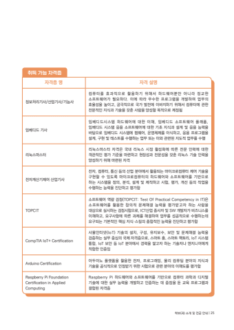 %ucde8%ub4dd %uac00%ub2a5 %uc790%uaca9%uc99d%uc790%uaca9%uc99d %uba85 %uc790%uaca9 %uc124%uba85%uc815%ubcf4%ucc98%ub9ac%uae30%uc0ac/%uc0b0%uc5c5%uae30%uc0ac/%uae30%ub2a5%uc0ac%ucef4%ud4e8%ud130%ub97c %ud6a8%uacfc%uc801%uc73c%ub85c %ud65c%uc6a9%ud558%uae30 %uc704%ud574%uc11c %ud558%ub4dc%uc6e8%uc5b4%ubfd0%ub9cc %uc544%ub2c8%ub77c %uc815%uad50%ud55c %uc18c%ud504%ud2b8%uc6e8%uc5b4%uac00 %ud544%uc694%ud558%ub2e4. %uc774%uc5d0 %ub530%ub77c %uc6b0%uc218%ud55c %ud504%ub85c%uadf8%ub7a8%uc744 %uac1c%ubc1c%ud558%uc5ec %uc5c5%ubb34%uc758 %ud6a8%uc728%uc131%uc744 %ub192%uc774%uace0, %uad81%uadf9%uc801%uc73c%ub85c %uad6d%uac00 %ubc1c%uc804%uc5d0 %uc774%ubc14%uc9c0%ud558%uae30 %uc704%ud574%uc11c %ucef4%ud4e8%ud130%uc5d0 %uad00%ud55c %uc804%ubb38%uc801%uc778 %uc9c0%uc2dd%uacfc %uae30%uc220%uc744 %uac16%ucd98 %uc0ac%ub78c%uc744 %uc591%uc131%ud560 %ubaa9%uc801%uc73c%ub85c %uc81c%uc815%ub428%uc784%ubca0%ub514%ub4dc %uae30%uc0ac%uc784%ubca0%ub514%ub4dc%uc2dc%uc2a4%ud15c %ud558%ub4dc%uc6e8%uc5b4%uc5d0 %ub300%ud55c %uc774%ud574, %uc784%ubca0%ub514%ub4dc %uc18c%ud504%ud2b8%uc6e8%uc5b4 %ud50c%ub798%ud3fc, %uc784%ubca0%ub514%ub4dc %uc2dc%uc2a4%ud15c %uc751%uc6a9 %uc18c%ud504%ud2b8%uc6e8%uc5b4%uc5d0 %ub300%ud55c %uae30%ucd08 %uc9c0%uc2dd%uacfc %uc124%uacc4 %ubc0f %uc751%uc6a9 %ub2a5%ub825%uc744 %ubc14%ud0d5%uc73c%ub85c %uc784%ubca0%ub514%ub4dc %uc2dc%uc2a4%ud15c%uc5d0 %ud38c%uc6e8%uc5b4, %uc6b4%uc601%uccb4%uc81c%ub97c %uc774%uc2dd%ud558%uace0, %uc751%uc6a9 %ud504%ub85c%uadf8%ub7a8%uc744 %uc124%uacc4, %uad6c%ud604 %ubc0f %ud14c%uc2a4%ud2b8%ub97c %uc218%ud589%ud558%ub294 %uc5c5%ubb34 %ub610%ub294 %uc774%uc640 %uad00%ub828%ub41c %uc9c0%ub3c4%uc801 %uc5c5%ubb34%ub97c %uc218%ud589%ub9ac%ub205%uc2a4%ub9c8%uc2a4%ud130%ub9ac%ub205%uc2a4%ub9c8%uc2a4%ud130 %uc790%uaca9%uc740 %uad6d%ub0b4 %ub9ac%ub205%uc2a4 %uc2dc%uc7a5 %ud65c%uc131%ud654%uc5d0 %ub530%ub978 %uc804%ubb38 %uc778%ub825%uc5d0 %ub300%ud55c %uac1d%uad00%uc801%uc778 %ud3c9%uac00 %uae30%uc900%uc744 %ub9c8%ub828%ud558%uace0 %ud604%uc7a5%uc131%uacfc %uc804%ubb38%uc131%uc744 %uac16%ucd98 %ub9ac%ub205%uc2a4 %uae30%uc220 %uc778%ub825%uc744 %uc591%uc131%ud558%uae30 %uc704%ud574 %ub9c8%ub828%ub41c %uc790%uaca9 %uc804%uc790%uacc4%uc0b0%uae30%uc81c%uc5b4 %uc0b0%uc5c5%uae30%uc0ac%uc804%uc790, %ucef4%ud4e8%ud130, %ud1b5%uc2e0 %ub4f1%uc758 %uc0b0%uc5c5 %ubd84%uc57c%uc5d0%uc11c %ud65c%uc6a9%ub418%ub294 %ub9c8%uc774%ud06c%ub85c%ucef4%ud4e8%ud130 %uc81c%uc5b4 %uae30%uc220%uc744 %uad6c%ud604%ud560 %uc218 %uc788%ub3c4%ub85d %ub9c8%uc774%ud06c%ub85c%ucef4%ud4e8%ud130%uc758 %ud558%ub4dc%uc6e8%uc5b4%uc640 %uc18c%ud504%ud2b8%uc6e8%uc5b4%ub97c %uae30%ubc18%uc73c%ub85c %ud558%ub294 %uc2dc%uc2a4%ud15c%uc744 %uc815%uc758, %ubd84%uc11d, %uc124%uacc4 %ubc0f %uc81c%uc791%ud558%uace0 %uc2dc%ud5d8, %ud3c9%uac00, %uac1c%uc120 %ub4f1%uc758 %uc791%uc5c5%uc744 %uc218%ud589%ud558%ub294 %ub2a5%ub825%uc744 %uc9c4%ub2e8%ud558%uace0 %ud3c9%uac00%ud568TOPCIT%uc18c%ud504%ud2b8%uc6e8%uc5b4 %uc5ed%ub7c9 %uac80%uc815(TOPCIT: Test Of Practical Competency in IT)%uc740 %uc18c%ud504%ud2b8%uc6e8%uc5b4%ub97c %ud65c%uc6a9%ud55c %ucc3d%uc758%uc801 %ubb38%uc81c%ud574%uacb0 %ub2a5%ub825%uc744 %ud3c9%uac00%ubc1b%uace0%uc790 %ud558%ub294 %uc0ac%ub78c%uc744 %ub300%uc0c1%uc73c%ub85c %uc2e4%uc2dc%ud558%ub294 %uac80%uc815%uc2dc%ud5d8%uc73c%ub85c, ICT%uc0b0%uc5c5 %uc885%uc0ac%uc790 %ubc0f SW %uac1c%ubc1c%uc790%uac00 %ube44%uc988%ub2c8%uc2a4%ub97c %uc774%ud574%ud558%uace0, %uc694%uad6c%uc0ac%ud56d%uc5d0 %ub530%ub978 %uacfc%uc81c%ub97c %ud574%uacb0%ud558%uc5ec %uc5c5%ubb34%ub97c %uc131%uacf5%uc801%uc73c%ub85c %uc218%ud589%ud558%ub294%ub370 %uc694%uad6c%ub418%ub294 %uae30%ubcf8%uc801%uc778 %ud575%uc2ec %uc9c0%uc2dd%u00b7%uc2a4%ud0ac%uc758 %uc885%ud569%uc801%uc778 %ub2a5%ub825%uc744 %uc9c4%ub2e8%ud558%uace0 %ud3c9%uac00%ud568CompTIA IoT+ Certification%uc0ac%ubb3c%uc778%ud130%ub137(IoT) %uae30%uc220%uc758 %uc124%uce58, %uad6c%uc131, %uc720%uc9c0%ubcf4%uc218, %ubcf4%uc548 %ubc0f %ubb38%uc81c%ud574%uacb0 %ub2a5%ub825%uc744 %uac80%uc99d%ud558%ub294 %uc2e4%ubb34 %uc911%uc2ec%uc758 %uad6d%uc81c %uc790%uaca9%uc99d%uc73c%ub85c, %uc2a4%ub9c8%ud2b8 %ud648, %uc2a4%ub9c8%ud2b8 %ud329%ud1a0%ub9ac, IoT %uc2dc%uc2a4%ud15c %ud1b5%ud569, IoT %ubcf4%uc548 %ub4f1 IoT %ubd84%uc57c%uc5d0%uc11c %uacbd%ub825%uc744 %uc313%uace0%uc790 %ud558%ub294 %uae30%uc220%uc790%ub098 %uc5d4%uc9c0%ub2c8%uc5b4%uc5d0%uac8c %uc801%ud569%ud55c %uc778%uc99d%uc784Arduino Certification %uc544%ub450%uc774%ub178 %ud50c%ub7ab%ud3fc%uc744 %ud65c%uc6a9%ud55c %uc804%uc790, %ud504%ub85c%uadf8%ub798%ubc0d, %ubb3c%ub9ac %ucef4%ud4e8%ud305 %ubd84%uc57c%uc758 %uc9c0%uc2dd%uacfc %uae30%uc220%uc744 %uacf5%uc2dd%uc801%uc73c%ub85c %uc778%uc815%ubc1b%uae30 %uc704%ud55c %uc2dc%ud5d8%uc73c%ub85c %uad00%ub828 %ubd84%uc57c%uc758 %uc774%ud574%ub3c4%ub97c %ud3c9%uac00%ud568Raspberry Pi FoundationCertification in Applied ComputingRaspberry Pi %ud558%ub4dc%uc6e8%uc5b4%uc640 %uc18c%ud504%ud2b8%uc6e8%uc5b4%ub97c %uae30%ubc18%uc73c%ub85c %ucef4%ud4e8%ud130 %uacfc%ud559%uacfc %ub514%uc9c0%ud138 %uae30%uc220%uc5d0 %ub300%ud55c %uc2e4%ubb34 %ub2a5%ub825%uc744 %uac1c%ubc1c%ud558%uace0 %uc778%uc99d%ud558%ub294 %ub370 %uc911%uc810%uc744 %ub454 %uad50%uc721 %ud504%ub85c%uadf8%ub7a8%uacfc %uacb0%ud569%ub41c %uc790%uaca9%uc99d%ud559%ubd80(%uacfc) %uc18c%uac1c %ubc0f %uc804%uacf5 %uc548%ub0b4 | 25