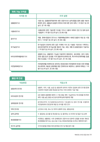 %uc9c1%uc5c5%uba85%uce6d %uc9c1%uc5c5%uc18c%uac1c%uc0dd%uba85%uacfc%ud559 %uc5f0%uad6c%uc6d0 %uc0dd%ubb3c%ud559, %uc758%uc57d, %uc2dd%ud488, %ub18d%uc5c5 %ub4f1 %uc0dd%uba85%uacfc%ud559 %ubd84%uc57c%uc758 %uc774%ub860%uacfc %uc751%uc6a9%uc5d0 %uad00%ud55c %uc5f0%uad6c%ub97c %ud1b5%ud574 %ub2e4%uc591%ud558%uba70 %ubcf5%uc7a1%ud55c %uc0dd%uba85 %ud604%uc0c1%uc744 %ud0d0%uad6c%ud558%uace0 %uc774%uc640 %uad00%ub828%ub41c %uae30%uc220 %uc801%uc6a9%ubc14%uc774%uc624%ubd84%uc57c %uc5f0%uad6c%uc6d0 %ubaa8%ub4e0 %ud615%ud0dc%uc758 %uc0dd%uba85%uccb4%uc5d0 %ub300%ud558%uc5ec %uadf8 %uae30%uc6d0, %ubc1c%ub2ec, %ud574%ubd80, %uae30%ub2a5%uad00%uacc4 %ubc0f %uae30%ud0c0 %uc6d0%ub9ac%ub97c %uc5f0%uad6c%ud558%uba70 %uc81c%uc57d, %uc2dd%ud488, %ub18d%uc5c5, %uc9c8%ubcd1, %ubcf4%uac74 %ub4f1%uc758 %ubd84%uc57c%uc5d0 %uc2e4%uc81c %uc801%uc6a9%ubd80%ubb38 %uac1c%ubc1c%uc0dd%ud0dc%ubc0f%ubd84%ub958 %uc5f0%uad6c%uc6d0 %ubd84%uc790%uc5d0%uc11c%ubd80%ud130 %uc9c0%uad6c%uc0dd%ud0dc%uacc4%uaddc%ubaa8%uae4c%uc9c0%uc758 %uae30%ucd08%uc0dd%ud0dc %ubc0f %ubd84%ub958 %uc5f0%uad6c%ub97c %uc218%ud589%ud558%uc5ec %uc790%uc5f0%uc0dd%ud0dc%uacc4%uc758 %ud604%uc548%ubb38%uc81c %ud574%uacb0 %ubc0f %uc720%uc9c0%ub97c %uc704%ud55c %uc5f0%uad6c%uc57d%ud559 %uc5f0%uad6c%uc6d0 %uc2e0%uc9c4%ub300%uc0ac %uacfc%uc815, %ud6a8%uc18c %ubc0f %uc758%uc57d%uc758 %uc0dd%ud654%ud559 %ubc18%uc751, %uc0dd%ud569%uc131%uacfc%uc815%uac80%uc5ed %uacf5%ubb34%uc6d0 %uc218%u00b7%ucd9c%uc785%ub418%ub294 %ub3d9%uc2dd%ubb3c %ubc0f %ucd95%uc0b0%ubb3c %ub610%ub294 %uc785%u00b7%ucd9c%uad6d%ud558%ub294 %ub0b4%u00b7%uc678%uad6d%uc778 %ubc0f %ud56d%uacf5%uae30 %ub4f1 %uac80%uc5ed%ud658%uacbd%uc601%ud5a5%ud3c9%uac00%uc0ac %uc790%uc5f0%ud658%uacbd, %uc0dd%ud65c%ud658%uacbd, %uc0ac%ud68c%u00b7%uacbd%uc81c%ud658%uacbd%uc758 %uc804%ubb38%uc9c0%uc2dd%uacfc %ud48d%ubd80%ud55c %uacbd%ud5d8%uc744 %ud1a0%ub300%ub85c %ud574%ub85c%uc6b4 %ud658%uacbd%uc601%ud5a5%uc744 %uc81c%uac70 %ub610%ub294 %uac10%uc18c%uc2dc%ud0ac %uc218 %uc788%ub294 %ud658%uacbd%ubcf4%uc804%ubc29%uc548%uc744 %uc870%uc0ac%ud558%uace0 %uc608%uce21%ud558%uba70 %ud3c9%uac00%uc5f0%uad6c%uc9c1 %uacf5%ubb34%uc6d0 %uad6d%uac00%uc758 %ubc1c%uc804%uc744 %uc704%ud574%uc11c %uc5ec%ub7ec %ubd84%uc57c%uc5d0%uc11c %uc5f0%uad6c %ubc0f %uac1c%ubc1c %uc5c5%ubb34 %uc218%ud589%uc878%uc5c5 %ud6c4 %uc9c4%ub85c%ucde8%ub4dd %uac00%ub2a5 %uc790%uaca9%uc99d%uc790%uaca9%uc99d %uba85 %uc790%uaca9 %uc124%uba85%uc0dd%ubb3c%ubd84%ub958%uae30%uc0ac%uc2dd%ubb3c %ub610%ub294 %ub3d9%ubb3c%ubd84%ub958%ud559%ubd84%uc57c%uc5d0 %ub300%ud55c %uc804%ubb38%uc9c0%uc2dd%uacfc %uc2e4%ubb34%uacbd%ud5d8%uc744 %ud1b5%ud574 %uc0dd%ubb3c %uc790%ub8cc%uc758 %uccb4%uacc4%uc801 %uad00%ub9ac, %uc0dd%ubb3c%uc0c1%uc758 %uc885%ud569%uc801 %ud30c%uc545%uacfc %uc774%uc5d0 %ub530%ub978 %uad00%ub9ac %ub300%ucc45 / 1%ucc28 %ud544%uae30 %ubc0f 2%ucc28 %uc2e4%uae30, %uc5f0 1%ud68c %uc2dc%ud589.%uc2dd%ubb3c%ubcf4%ud638%uae30%uc0ac %uc2dd%ubb3c%ubcf4%ud638%uc5d0 %uad00%ud55c %uae30%uc220%uc774%ub860 %uc9c0%uc2dd%uc744 %uac00%uc9c0%uace0 %uc2dd%ubb3c%uc758 %ud53c%ud574%uc758 %uc9c4%ub2e8 %ubc0f %ubc29%uc81c %ub4f1%uc758 %uae30%uc220%uc5c5%ubb34 / 1%ucc28 %ud544%uae30 %ubc0f 2%ucc28 %uc2e4%uae30, %uc5f0 3%ud68c %uc2dc%ud589.%uc885%uc790%uae30%uc0ac %uc791%ubb3c, %uc6d0%uc608%uc2dc%ud5d8%uc7a5%uc758 %uc5f0%uad6c%uc18c%ub098 %uc791%ubb3c%uc7ac%ubc30%ub18d%uc7a5%uc5d0%uc11c %uc0c8%ub85c%uc6b4 %ud488%uc885%uc758 %uc721%uc131 %ub4f1 %uc2dc%ud5d8 %uc5f0%uad6c / 1%ucc28 %ud544%uae30 %ubc0f 2%ucc28 %uc2e4%uae30, %uc5f0 3%ud68c %uc2dc%ud589.%uc720%uae30%ub18d%uc5c5%uae30%uc0ac%uc720%uae30%ub18d%uc5c5%uc758 %uc804%ubc18%uc5d0 %uad00%ud55c %uae4a%uc740 %uc774%ud574%uc640 %uc9c0%uc2dd %ubc0f %uae30%uc220%uc744 %uae30%ubc18%uc73c%ub85c %uae30%ud68d%ud558%uace0, %uc0dd%uc0b0%uad00%ub9ac%uc5c5%ubb34%uc640 %uc720%uae30%ub18d%uc0b0%ubb3c %uc6d0%ub8cc%uc758 %uac00%uacf5, %ud3ec%uc7a5, %uc720%ud1b5 %ubc0f %ud488%uc9c8%uc778%uc99d%uacfc %uae30%uc220%uc9c0%ub3c4 / 1%ucc28 %ud544%uae30 %ubc0f 2%ucc28 %uc2e4%uae30, %uc5f0 3%ud68c %uc2dc%ud589.%ubc14%uc774%uc624%ud654%ud559%uc81c%ud488%uc81c%uc870%uae30%uc0ac%uc0dd%ubb3c%uccb4 %ub610%ub294 %uc0dd%ubb3c%uccb4%uc758 %uae30%ub2a5%uc744 %uc774%uc6a9%ud558%uc5ec %ubc30%uc591%uc900%ube44, %uc0dd%uc0b0%ubc30%uc591, %ubd84%ub9ac%u00b7%uc815%uc81c, %uc804%ud658%u00b7%uc911%ud569 %ub4f1%uc758 %uacf5%uc815%uc744 %uac70%uccd0 %ubc94%uc6a9%ubc14%uc774%uc624%ud654%ud559%uc18c%uc7ac, %ud2b9%uc218%ubc14%uc774%uc624%ud654%ud559%uc81c%ud488 %ub4f1%uc744 %uc81c%uc870 %ubc0f %ud488%uc9c8 / 1%ucc28 %ud544%uae30 %ubc0f 2%ucc28 %uc2e4%uae30, %uc5f0 1%ud68c %uc2dc%ud589.%uc790%uc5f0%uc0dd%ud0dc%ubcf5%uc6d0%uae30%uc0ac%uc790%uc5f0%uc0dd%ud0dc%uacc4%ub97c %uccb4%uacc4%uc801%uc73c%ub85c %uad00%ub9ac%ud558%uace0 %ud658%uacbd%uc624%uc5fc%uacfc %uc790%uc5f0%uc0dd%ud0dc%uacc4 %ud30c%uad34%ub85c %uc778%ud55c %ud53c%ud574%ub97c %ucd5c%uc18c%ud654%ud558%uba70, %ud6fc%uc190%ub41c %uc0dd%ud0dc%uacc4%ub97c %ud658%uacbd %uce5c%ud654%uc801%uc73c%ub85c %ubcf5%uc6d0%ud558%uace0, %uc0dd%ud0dc%uacc4 %uc704%ud574%uc131 / 1%ucc28 %ud544%uae30 %ubc0f 2%ucc28 %uc2e4%uae30, %uc5f0 3%ud68c %uc2dc%ud589.%ud559%ubd80(%uacfc) %uc18c%uac1c %ubc0f %uc804%uacf5 %uc548%ub0b4 | 35