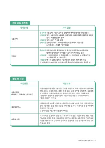 %uc9c1%uc5c5%uba85%uce6d %uc9c1%uc5c5%uc18c%uac1c%uc2dd%ud488%uc0b0%uc5c5%uccb4(%ud488%uc9c8%uad00%ub9ac, %uc5f0%uad6c%uac1c%ubc1c, %uc0dd%uc0b0%uad00%ub9ac)%uc2dd%ud488%uae30%uc220%ubd84%uc57c%uc5d0 %ub300%ud55c %uae30%ubcf8%uc801%uc778 %uc9c0%uc2dd%uc744 %ubc14%ud0d5%uc73c%ub85c %ud558%uc5ec %uc2dd%ud488%uc7ac%ub8cc%uc758 %uc120%ud0dd%uc5d0%uc11c%ubd80%ud130 %uc0c8%ub85c%uc6b4 %uc2dd%ud488%uc758 %uae30%ud68d, %uac1c%ubc1c, %ubd84%uc11d, %uac80%uc0ac %ub4f1%uc758 %uc5c5%ubb34%ub97c %ub2f4%ub2f9%ud558%uba70, %uc2dd%ud488%uc81c%uc870 %ubc0f %uac00%uacf5%uacf5%uc815, %uc2dd%ud488%uc758 %ubcf4%uc874%uacfc %uc800%uc7a5 %uacf5%uc815%uc5d0 %ub300%ud55c %uad00%ub9ac, %uac10%ub3c5%uc758 %uc5c5%ubb34%ub97c %uc218%ud589 / %uad00%ub828%ud559%uacfc %uc878%uc5c5%uc790 %ubc0f %uc878%uc5c5%uc608%uc815%uc790, %uc2dd%ud488%uae30%uc0ac %ubc0f %uc704%uc0dd%uc0ac %uc790%uaca9 %ucde8%ub4dd%uc790 %uc6b0%ub300 / %ud558%ub9bc, %uc624%ub9ac%uc628, %uc11c%uc8fc %ub4f1%uad6d%uacf5%ub9bd%uc5f0%uad6c%uc18c%uc2dd%ud488%uad00%ub828 %uc804%ubb38 %uc9c0%uc2dd%uc744 %ubc14%ud0d5%uc73c%ub85c %uc2dd%ud488%uc0b0%uc5c5 %uae30%ubc18%uae30%uc220 %uace0%ub3c4%ud654 %uc5f0%uad6c, %uc2dd%ud488 %uc704%ud574%uc778%uc790 %uad00%ub9ac %uae30%uc220%uac1c%ubc1c, %uac74%uac15 %uac1c%uc120 %uae30%ub2a5%uc131 %uc18c%uc7ac %uac1c%ubc1c %ub4f1 %uc8fc%uc694 %uad6d%uac00%uae30%uad00 %ubc0f %uc5f0%uad6c%uc18c%uc5d0%uc11c %ucc3d%uc758%uc801%uc778 %uc5f0%uad6c %uc218%ud589 / %ud55c%uad6d%uc2dd%ud488%uc5f0%uad6c%uc6d0, %uad6d%uac00%uc2dd%ud488%ud074%ub7ec%uc2a4%ud130 %ub4f1%ub300%ud559%uc6d0 %uc9c4%ud559%uae30%ucd08%uacfc%ud559%uc744 %uc751%uc6a9%ud558%uc5ec %uc548%uc804%ud558%uace0 %ubd80%uac00%uac00%uce58%uac00 %ub192%uc740 %uc2dd%ud488%uc18c%uc7ac%uc758 %uac1c%ubc1c, %uc2dd%ud488%uae30%ub2a5%uc131%uc758 %uccb4%uacc4%uc801 %ud574%uc11d, %uc2dd%ud488%uacf5%uc815%uc758 %ucca8%ub2e8%uae30%uc220 %uac1c%ubc1c %ub4f1 %uc2dd%ud488%ubd84%uc57c%uc758 %uae30%ucd08%uc9c0%uc2dd%uacfc %uc774%ub860%uc744 %uccb4%uacc4%uc801%uc73c%ub85c %uc2b5%ub4dd%ud558%uc5ec %ucc3d%uc758%ub825%uacfc %uc751%uc6a9%ub825%uc744 %uac16%ucd98 %uc5f0%uad6c%uc6d0%uc73c%ub85c%uc11c%uc758 %uae30%ucd08 %uc9c0%uc2dd %uc2b5%ub4dd %uacfc%uc815%uc878%uc5c5 %ud6c4 %uc9c4%ub85c%ucde8%ub4dd %uac00%ub2a5 %uc790%uaca9%uc99d%uc790%uaca9%uc99d %uba85 %uc790%uaca9 %uc124%uba85%uc2dd%ud488%uae30%uc0ac%uc751%uc2dc%uc790%uaca9 %uc2dd%ud488%uacf5%ud559, %uc2dd%ud488%uac00%uacf5%ud559 %ub4f1 %uad00%ub828%ud559%uacfc %ub300%ud559 %uc878%uc5c5%uc608%uc815%uc790 %ubc0f %uc878%uc5c5%uc790%uc2dc%ud5d8%uacfc%ubaa9 %ud544%uae30 : %uc2dd%ud488%uc704%uc0dd%ud559, %uc2dd%ud488%ud654%ud559, %uc2dd%ud488%uac00%uacf5%ud559, %uc2dd%ud488%ubbf8%uc0dd%ubb3c%ud559, %uc0dd%ud654%ud559 %ubc0f %ubc1c%ud6a8%ud559 %uc2e4%uae30 : %uc2dd%ud488%uc0dd%uc0b0%uad00%ub9ac %uc2e4%ubb34%uc2dc%ud5d8%uc77c%uc815 %ud544%uae30 : %uc2e4%uae30 %uc5f0 3%ud68c %uc2e4%ud589%uc900%ube44%uae30%uac04 %uacf5%ubd80%ub7c9%uc5d0 %ub530%ub77c %ub2e4%ub974%uc9c0%ub9cc %uc5ec%uc720%uc788%uac8c %uc900%ube44%ud574%uc57c %ub418%ub294 %uc2dc%ud5d8 (%ub09c%uc774%ub3c4 %uc788%ub294 %uc790%uaca9%uc99d *%ud050%ub137 %ucc38%uace0)%uc704%uc0dd%uc0ac%uc751%uc2dc%uc790%uaca9 %uad00%ub828%ud559%uacfc %ub300%ud559 %uc878%uc5c5%uc608%uc815%uc790 %ubc0f %uc878%uc5c5%uc790 / %uad00%ub828%ud559%uacfc %uad50%uacfc%ubaa9 %uc774%uc218 (%ud55c%uad6d%ubcf4%uac74%uc758%ub8cc%uc778%uad6d%uac00%uc2dc%ud5d8%uc6d0 %u2013 %uc751%uc2dc%uc790%uaca9 %uc790%uac00%uc9c4%ub2e8 %ucc38%uace0)%uc2dc%ud5d8%uacfc%ubaa9 1. %uc704%uc0dd%uad00%uacc4%ubc95%ub839 2. %ud658%uacbd%uc704%uc0dd%ud559 3. %uc704%uc0dd%uace4%ucda9%ud559 4. %uace4%uc911%ubcf4%uac74%ud559 5. %uc2dd%ud488%uc704%uc0dd%ud559 6. %uc2e4%uae30%uc2dc%ud5d8%uc2dc%ud5d8%uc77c%uc815 %uc5f0 1%ud68c %uc2e4%ud589 / %ud569%uaca9%uc790 %uae30%uc900 %ub9e4 %uacfc%ubaa9 %ub9cc%uc810%uc758 40%ud37c%uc13c%ud2b8 %uc774%uc0c1%uc804 %uacfc%ubaa9 %ucd1d%uc810%uc758 60%ud37c%uc13c%ud2b8 %uc774%uc0c1 %uc2e4%uae30%uc2dc%ud5d8 %ucd1d%uc810%uc758 60%ud37c%uc13c%ud2b8 %uc774%uc0c1 %ub4dd%uc810%ud55c %uc790%ud559%ubd80(%uacfc) %uc18c%uac1c %ubc0f %uc804%uacf5 %uc548%ub0b4 | 51
