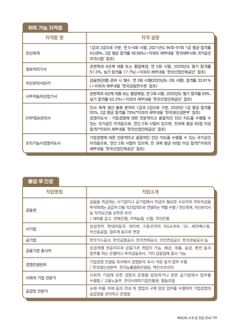 %uc9c1%uc5c5%uba85%uce6d %uc9c1%uc5c5%uc18c%uac1c%uae08%uc735%uad8c%uae08%uc735%uc744 %ucde8%uae09%ud558%ub294 %uc0ac%uae30%uc5c5%uc774%ub098 %uacf5%uae30%uc5c5%uc5d0%uc11c %uc790%uae08%uc774 %ud544%uc694%ud55c %uc218%uc694%uc790%uc640 %uc5ec%uc720%uc790%uae08%uc744 %ud22c%uc790%ud558%ub824%ub294 %uacf5%uae09%uc790 %uac04%uc744 %uc9c1%uac04%uc811%uc801%uc73c%ub85c %uc5f0%uacb0%ud558%ub294 %uc5ed%ud560 %uc218%ud589 / %uc804%uc0b0%ud68c%uacc4, %uc790%uc0b0%uad00%ub9ac%uc0ac %ub4f1 %uc790%uaca9%uc694%uac74%uc744 %uac16%ucd94%uba74 %uc720%ub9ac / %uc0c8%ub9c8%uc744 %uae08%uace0, %uc804%ubd81%uc740%ud589, %uc9c0%uc5ed%ub18d%ud611, %uc2e0%ud611, %uad6d%ubbfc%uc740%ud589 %uc0ac%uae30%uc5c5 %uc0bc%uc131%uc804%uc790, %ud604%ub300%uc790%ub3d9%ucc28, %ub124%uc774%ubc84, %uad6c%uae00%ucf54%ub9ac%uc544, NS%uc18c%ud504%ud2b8, SK, %uc138%uc544%ubca0%uc2a4%ud2f8, %ub450%uc0b0%uc911%uacf5%uc5c5, %ucc38%ud504%ub808 %ub4f1%uc73c%ub85c %ubcc0%uacbd %uacf5%uae30%uc5c5 %ud55c%uad6d%uac00%uc2a4%uacf5%uc0ac, %ud55c%uad6d%uacf5%ud56d%uacf5%uc0ac, %ud55c%uad6d%uc804%ub825%uacf5%uc0ac, %uad6d%ubbfc%uc5f0%uae08%uacf5%ub2e8, %ud55c%uad6d%uad00%uad11%uacf5%uc0ac %ub4f1%uae08%uc735%uae30%uad00 %uc885%uc0ac%uc790 %uc0c1%uacbd%uacc4%uc5f4 %uc804%uacf5%uc774%ubbc0%ub85c %uae08%uc735%uae30%uad00 %ucde8%uc5c5%uc774 %uac00%ub2a5. %uc608%uae08, %ub300%ucd9c, %uc1a1%uae08, %ud658%uc804 %ub4f1%uc758 %uc5c5%ubb34%ub97c %ud558%ub294 %uc740%ud589%uc774%ub098 %ud22c%uc790%uae08%uc735%ud68c%uc0ac, %uae30%ud0c0 %uae08%uc735%uc5c5%uc5d0 %uc885%uc0ac %uac00%ub2a5%uacbd%uc601%ucee8%uc124%ud134%ud2b8 %uae30%uc5c5%uacbd%uc601 %ucee8%uc124%ud305 %ud68c%uc0ac%uc5d0%uc11c %uacbd%uc601%ubd84%uc11d%u00b7%uc870%uc0ac%u00b7%uc790%ubb38 %ub4f1%uc758 %uc5c5%ubb34 %uc218%ud589/ %ud55c%uad6d%uc0dd%uc0b0%uc131%ubcf8%ubd80, %ud55c%uad6d%ub2a5%ub960%ud611%ud68c%ucee8%uc124%ud305, %ub9e5%ud0a8%uc9c0%ucf54%ub9ac%uc544 %uc0ac%ud68c%uc801 %uae30%uc5c5 %uc804%ubb38%uac00 %uc0ac%ud68c%uc801 %uae30%uc5c5%uc5d0 %uad00%ud55c %uacbd%uc601%uacfc %uc6b4%uc601%uc744 %ub2f4%ub2f9%ud558%uac70%ub098 %uad00%ub828 %uacf5%uae30%uc5c5%uc5d0%uc11c %uc5c5%ubb34%ub97c %uc218%ud589%ud568 / %uace0%uc6a9%ub178%ub3d9%ubd80, %ud55c%uad6d%uc0ac%ud68c%uc801%uae30%uc5c5%uc9c4%ud765%uc6d0, %ud611%ub3d9%uc870%ud569%uacf5%uae09%ub9dd %uc804%ubb38%uac00 %uc18c%uc7ac%u00b7%ubd80%ud488%u00b7%uc790%uc7ac %ub4f1%uc758 %uad6d%ub0b4%u00b7%uc678 %uc601%uc5c5%uacfc %uad6c%ub9e4 %ub2f4%ub2f9 %uc5c5%ubb34%ub97c %uc218%ud589%ud558%uc5ec %uae30%uc5c5%uacbd%uc601%uc758 %uacf5%uae09%ub9dd%uc744 %uad00%ub9ac%ud558%uace0 %uc6b4%uc601%ud568%uc878%uc5c5 %ud6c4 %uc9c4%ub85c%ucde8%ub4dd %uac00%ub2a5 %uc790%uaca9%uc99d%uc790%uaca9%uc99d %uba85 %uc790%uaca9 %uc124%uba85%uc804%uc0b0%ud68c%uacc41%uae09%uacfc 2%uae09%uc73c%ub85c %uad6c%ubd84, %uc5f0 5~6%ud68c %uc2dc%ud589, 2021%ub144%ub3c4 94%ud68c~97%ud68c 1%uae09 %ud3c9%uade0 %ud569%uaca9%ub960 43.09%, 2%uae09 %ud3c9%uade0 %ud569%uaca9%ub960 56.56%(%uff0a%uc774%uc678%uc758 %uc138%ubd80%ub0b4%uc6a9 %u2018%ud55c%uad6d%uc138%ubb34%uc0ac%ud68c %uad6d%uac00%uacf5%uc778%uc790%uaca9%uc2dc%ud5d8%u2019 %ucc38%uc870)%uc815%ubcf4%ucc98%ub9ac%uae30%uc0ac %uad00%ub828%ud559%uacfc 4%ub144%uc81c %ub300%uc878 %ub610%ub294 %uc878%uc5c5%uc608%uc815, %uc5f0 3%ud68c %uc2dc%ud589, 2020%ub144%ub3c4 %ud544%uae30 %ud569%uaca9%ub960 57.3%, %uc2e4%uae30 %ud569%uaca9%ub960 17.7%(%uff0a%uc774%uc678%uc758 %uc138%ubd80%ub0b4%uc6a9 %u2018%ud55c%uad6d%uc0b0%uc5c5%uc778%ub825%uacf5%ub2e8%u2019 %ucc38%uc870)%uc790%uc0b0%uad00%ub9ac%uc0ac(EP) %uae08%uc735%uad8c(%uc740%ud589) %uc900%ube44 %uc2dc %ud544%uc218, %uc5f0 3%ud68c %uc2dc%ud589(2020%ub144%ub3c4 2%ud68c %uc2dc%ud589), %ud569%uaca9%ub960 33.81%(%uff0a%uc774%uc678%uc758 %uc138%ubd80%ub0b4%uc6a9 %u2018%ud55c%uad6d%uae08%uc735%uc5f0%uc218%uc6d0%u2019 %ucc38%uc870)%uc0ac%ubb34%uc790%ub3d9%ucc28%uc0b0%uc5c5%uae30%uc0ac %uad00%ub828%ud559%uacfc 4%ub144%uc81c %ub300%uc878 %ub610%ub294 %uc878%uc5c5%uc608%uc815, %uc5f0 3%ud68c %uc2dc%ud589, 2020%ub144%ub3c4 %ud544%uae30 %ud569%uaca9%ub960 59%, %uc2e4%uae30 %ud569%uaca9%ub960 63.2%(%uff0a%uc774%uc678%uc758 %uc138%ubd80%ub0b4%uc6a9 %u2018%ud55c%uad6d%uc0b0%uc5c5%uc778%ub825%uacf5%ub2e8%u2019 %ucc38%uc870)ERP%uc815%ubcf4%uad00%ub9ac%uc0ac%uc778%uc0ac%u00b7%ud68c%uacc4%u00b7%uc0dd%uc0b0%u00b7%ubb3c%ub958 %ubd84%uc57c%uc758 1%uae09%uacfc 2%uae09%uc73c%ub85c %uad6c%ubd84, 2020%ub144 1%uae09 %ud3c9%uade0 %ud569%uaca9%ub960 55%, 2%uae09 %ud3c9%uade0 %ud569%uaca9%ub960 75%(*%uc774%uc678%uc758 %uc138%ubd80%ub0b4%uc6a9 %u2018%ud55c%uad6d%uc0dd%uc0b0%uc131%ubcf8%ubd80%u2019 %ucc38%uc870) %uacbd%uc601%uc9c0%ub3c4%uc0ac : %uae30%uc5c5%uacbd%uc601%uc5d0 %ub300%ud55c %uc804%ubb38%uc801%uc774%uace0 %uc885%ud569%uc801%uc778 %uc9c4%ub2e8%u00b7%uc9c0%ub3c4%ub97c %uc218%ud589%ud560 %uc218 %uc788%ub294 %uad6d%uac00%uacf5%uc778 %uc790%uaca9%uc99d%uc73c%ub85c, %uc5f0%uac04 2%ud68c %uc2dc%ud5d8%uc774 %uc788%uc73c%uba70, %uc804%uacfc%ubaa9 %ud3c9%uade0 60%uc810 %uc774%uc0c1 %ud569%uaca9(*%uc774%uc678%uc758 %uc138%ubd80%ub0b4%uc6a9 %u2018%ud55c%uad6d%uc0b0%uc5c5%uc778%ub825%uacf5%ub2e8%u2019 %ucc38%uc870)%uc870%ub9ac%uae30%ub2a5%uc0ac%uacbd%uc601%uc9c0%ub3c4%uc0ac%uae30%uc5c5%uacbd%uc601%uc5d0 %ub300%ud55c %uc804%ubb38%uc801%uc774%uace0 %uc885%ud569%uc801%uc778 %uc9c4%ub2e8%u00b7%uc9c0%ub3c4%ub97c %uc218%ud589%ud560 %uc218 %uc788%ub294 %uad6d%uac00%uacf5%uc778 %uc790%uaca9%uc99d%uc73c%ub85c, %uc5f0%uac04 2%ud68c %uc2dc%ud5d8%uc774 %uc788%uc73c%uba70, %uc804 %uacfc%ubaa9 %ud3c9%uade0 60%uc810 %uc774%uc0c1 %ud569%uaca9(*%uc774%uc678%uc758 %uc138%ubd80%ub0b4%uc6a9 %u2018%ud55c%uad6d%uc0b0%uc5c5%uc778%ub825%uacf5%ub2e8%u2019 %ucc38%uc870)%ud559%ubd80(%uacfc) %uc18c%uac1c %ubc0f %uc804%uacf5 %uc548%ub0b4 | 55