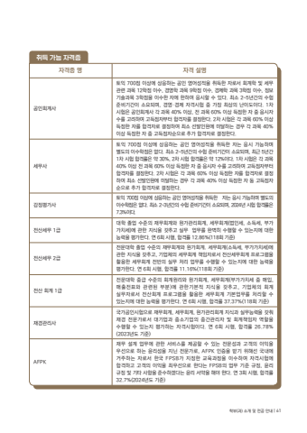 %ucde8%ub4dd %uac00%ub2a5 %uc790%uaca9%uc99d%uc790%uaca9%uc99d %uba85 %uc790%uaca9 %uc124%uba85%uacf5%uc778%ud68c%uacc4%uc0ac%ud1a0%uc775 700%uc810 %uc774%uc0c1%uc5d0 %uc0c1%uc751%ud558%ub294 %uacf5%uc778 %uc601%uc5b4%uc131%uc801%uc744 %ucde8%ub4dd%ud55c %uc790%ub85c%uc11c %ud68c%uacc4%ud559 %ubc0f %uc138%ubb34 %uad00%ub828 %uacfc%ubaa9 12%ud559%uc810 %uc774%uc218, %uacbd%uc601%ud559 %uacfc%ubaa9 9%ud559%uc810 %uc774%uc218, %uacbd%uc81c%ud559 %uacfc%ubaa9 3%ud559%uc810 %uc774%uc218, %uc815%ubcf4%uae30%uc220%uacfc%ubaa9 3%ud559%uc810%uc744 %uc774%uc218%ud55c %uc790%uc5d0 %ud55c%ud558%uc5ec %uc751%uc2dc%ud560 %uc218 %uc788%ub2e4. %ucd5c%uc18c 2~5%ub144%uac04%uc758 %uc218%ud5d8%uc900%ube44%uae30%uac04%uc774 %uc18c%uc694%ub418%uba70, %uacbd%uc601%u00b7%uacbd%uc81c %uc790%uaca9%uc2dc%ud5d8 %uc911 %uac00%uc7a5 %ucd5c%uc0c1%uc758 %ub09c%uc774%ub3c4%uc774%ub2e4. 1%ucc28 %uc2dc%ud5d8%uc740 %uacf5%uc778%ud68c%uacc4%uc0ac %uac01 %uacfc%ubaa9 40% %uc774%uc0c1, %uc804 %uacfc%ubaa9 60% %uc774%uc0c1 %ub4dd%uc810%ud55c %uc790 %uc911 %uc751%uc2dc%uc790 %uc218%ub97c %uace0%ub824%ud558%uc5ec %uace0%ub4dd%uc810%uc790%ubd80%ud130 %ud569%uaca9%uc790%ub97c %uacb0%uc815%ud55c%ub2e4. 2%ucc28 %uc2dc%ud5d8%uc740 %uac01 %uacfc%ubaa9 60% %uc774%uc0c1 %ub4dd%uc810%ud55c %uc790%ub97c %ud569%uaca9%uc790%ub85c %uacb0%uc815%ud558%uc5ec %ucd5c%uc18c %uc120%ubc1c%uc778%uc6d0%uc5d0 %ubbf8%ub2ec%ud558%ub294 %uacbd%uc6b0 %uac01 %uacfc%ubaa9 40% %uc774%uc0c1 %ub4dd%uc810%ud55c %uc790 %uc911 %uace0%ub4dd%uc810%uc790%uc21c%uc73c%ub85c %ucd94%uac00 %ud569%uaca9%uc790%ub85c %uacb0%uc815%ud55c%ub2e4.%uc138%ubb34%uc0ac%ud1a0%uc775 700%uc810 %uc774%uc0c1%uc5d0 %uc0c1%uc751%ud558%ub294 %uacf5%uc778 %uc601%uc5b4%uc131%uc801%uc744 %ucde8%ub4dd%ud55c %uc790%ub294 %uc751%uc2dc %uac00%ub2a5%ud558%uba70 %ubcc4%ub3c4%uc758 %uc774%uc218%ud559%uc810%uc740 %uc5c6%ub2e4. %ucd5c%uc18c 2~5%ub144%uac04%uc758 %uc218%ud5d8 %uc900%ube44%uae30%uac04%uc774 %uc18c%uc694%ub418%uba70, %ucd5c%uadfc 5%ub144%uac04 1%ucc28 %uc2dc%ud5d8 %ud569%uaca9%ub960%uc740 %uc57d 30%, 2%ucc28 %uc2dc%ud5d8 %ud569%uaca9%ub960%uc740 %uc57d 12%%uc774%ub2e4. 1%ucc28 %uc2dc%ud5d8%uc740 %uac01 %uacfc%ubaa9 40% %uc774%uc0c1 %uc804 %uacfc%ubaa9 60% %uc774%uc0c1 %ub4dd%uc810%ud55c %uc790 %uc911 %uc751%uc2dc%uc790 %uc218%ub97c %uace0%ub824%ud558%uc5ec %uace0%ub4dd%uc810%uc790%ubd80%ud130 %ud569%uaca9%uc790%ub97c %uacb0%uc815%ud55c%ub2e4. 2%ucc28 %uc2dc%ud5d8%uc740 %uac01 %uacfc%ubaa9 60% %uc774%uc0c1 %ub4dd%uc810%ud55c %uc790%ub97c %ud569%uaca9%uc790%ub85c %uacb0%uc815%ud558%uc5ec %ucd5c%uc18c %uc120%ubc1c%uc778%uc6d0%uc5d0 %ubbf8%ub2ec%ud558%ub294 %uacbd%uc6b0 %uac01 %uacfc%ubaa9 40% %uc774%uc0c1 %ub4dd%uc810%ud55c %uc790 %ub465 %uace0%ub4dd%uc810%uc790%uc21c%uc73c%ub85c %ucd94%uac00 %ud569%uaca9%uc790%ub85c %uacb0%uc815%ud55c%ub2e4.%uac10%uc815%ud3c9%uac00%uc0ac%ud1a0%uc775 700%uc810 %uc774%uc0c1%uc5d0 %uc0c1%uc751%ud558%ub294 %uacf5%uc778 %uc601%uc5b4%uc131%uc801%uc744 %ucde8%ub4dd%ud55c %uc790%ub294 %uc751%uc2dc %uac00%ub2a5%ud558%uba70 %ubcc4%ub3c4%uc758 %uc774%uc218%ud559%uc810%uc740 %uc5c6%ub2e4. %ucd5c%uc18c 2~3%ub144%uac04%uc758 %uc218%ud5d8 %uc900%ube44%uae30%uac04%uc774 %uc18c%uc694%ub418%uba70, 2024%ub144 %uc2dc%ud5d8 %ud569%uaca9%ub960%uc740 7.3%%uc774%ub2e4.%uc804%uc0b0%uc138%ubb34 1%uae09%ub300%ud559 %uc878%uc5c5 %uc218%uc900%uc758 %uc7ac%ubb34%ud68c%uacc4%uc640 %uc6d0%uac00%uad00%ub9ac%ud68c%uacc4, %uc138%ubb34%ud68c%uacc4(%ubc95%uc778%uc138, %uc18c%ub4dd%uc138, %ubd80%uac00%uac00%uce58%uc138)%uc5d0 %uad00%ud55c %uc9c0%uc2dd%uc744 %uac16%ucd94%uace0 %uc2e4%ubb34 %uc5c5%ubb34%ub97c %uc644%ubcbd%ud788 %uc218%ud589%ud560 %uc218 %uc788%ub294%uc9c0%uc5d0 %ub300%ud55c %ub2a5%ub825%uc744 %ud3c9%uac00%ud55c%ub2e4. %uc5f0 6%ud68c %uc2dc%ud589, %ud569%uaca9%ub960 12.86%(118%ud68c %uae30%uc900)%uc804%uc0b0%uc138%ubb34 2%uae09%uc804%ubb38%ub300%ud559 %uc878%uc5c5 %uc218%uc900%uc758 %uc7ac%ubb34%ud68c%uacc4%uc640 %uc6d0%uac00%ud68c%uacc4. %uc138%ubb34%ud68c%uacc4(%uc18c%ub4dd%uc138, %ubd80%uac00%uac00%uce58%uc138)%uc5d0 %uad00%ud55c %uc9c0%uc2dd%uc744 %uac16%ucd94%uace0, %uae30%uc5c5%uccb4%uc758 %uc138%ubb34%ud68c%uacc4 %ucc45%uc784%uc790%ub85c%uc11c %uc804%uc0b0%uc138%ubb34%ud68c%uacc4 %ud504%ub85c%uadf8%ub7a8%uc744 %ud65c%uc6a9%ud55c %uc138%ubb34%ud68c%uacc4 %uc804%ubc18%uc758 %uc2e4%ubb34 %ucc98%ub9ac %uc5c5%ubb34%ub97c %uc218%ud589%ud560 %uc218 %uc788%ub294%uc9c0%uc5d0 %ub300%ud55c %ub2a5%ub825%uc744 %ud3c9%uac00%ud55c%ub2e4. %uc5f0 6%ud68c %uc2dc%ud589, %ud569%uaca9%ub960 11.16%(118%ud68c %uae30%uc900)%uc804%uc0b0 %ud68c%uacc4 1%uae09%uc804%ubb38%ub300%ud559 %uc911%uae09 %uc218%uc900%uc758 %ud68c%uacc4%uc6d0%ub9ac%uc640 %uc6d0%uac00%ud68c%uacc4, %uc138%ubb34%ud68c%uacc4(%ubd80%uac00%uac00%uce58%uc138 %uc911 %ub9e4%uc785,%ub9e4%ucd9c%uc804%ud45c%uc640 %uad00%ub828%ub41c %ubd80%ubd84)%uc5d0 %uad00%ud55c%uae30%ubcf8%uc801 %uc9c0%uc2dd%uc744 %uac16%ucd94%uace0, %uae30%uc5c5%uccb4%uc758 %ud68c%uacc4%uc2e4%ubb34%uc790%ub85c%uc11c %uc804%uc0b0%ud68c%uacc4 %ud504%ub85c%uadf8%ub7a8%uc744 %ud65c%uc6a9%ud55c %uc138%ubb34%ud68c%uacc4 %uae30%ubcf8%uc5c5%ubb34%ub97c %ucc98%ub9ac%ud560 %uc218 %uc788%ub294%uc9c0%uc5d0 %ub300%ud55c %ub2a5%ub825%uc744 %ud3c9%uac00%ud55c%ub2e4. %uc5f0 6%ud68c %uc2dc%ud589, %ud569%uaca9%ub960 37.37%(118%ud68c %uae30%uc900)%uc7ac%uacbd%uad00%ub9ac%uc0ac%uad6d%uac00%uacf5%uc778%uc2dc%ud5d8%uc73c%ub85c %uc7ac%ubb34%ud68c%uacc4, %uc138%ubb34%ud68c%uacc4, %uc6d0%uac00%uad00%ub9ac%ud68c%uacc4 %uc9c0%uc2dd%uacfc %uc2e4%ubb34%ub2a5%ub825%uc744 %uac16%ucdb0%uc7ac%uacbd %uc804%ubb38%uac00%ub85c%uc11c %ub300%uae30%uc5c5%uacfc %uc911%uc18c%uae30%uc5c5%uc758 %uc911%uac04%uad00%ub9ac%uc790 %ubc0f %ud68c%uacc4%ucc45%uc784%uc790 %uc5ed%ud560%uc744%uc218%ud589%ud560 %uc218 %uc788%ub294%uc9c0 %ud3c9%uac00%ud558%ub294 %uc790%uaca9%uc2dc%ud5d8%uc774%ub2e4. %uc5f0 6%ud68c %uc2dc%ud589, %ud569%uaca9%ub960 26.78%(2023%ub144%ub3c4 %uae30%uc900)AFPK%uc7ac%ubb34 %uc124%uacc4 %uc5c5%ubb34%uc5d0 %uad00%ud55c %uc11c%ube44%uc2a4%ub97c %uc81c%uacf5%ud560 %uc218 %uc788%ub294 %uc804%ubb38%uc131