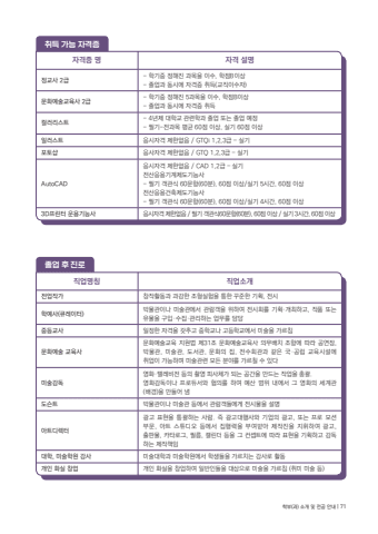 %uc9c1%uc5c5%uba85%uce6d %uc9c1%uc5c5%uc18c%uac1c%uc804%uc5c5%uc791%uac00 %ucc3d%uc791%ud65c%ub3d9%uacfc %uacfc%uac10%ud55c %uc870%ud615%uc2e4%ud5d8%uc744 %ud1b5%ud55c %uafb8%uc900%ud55c %uae30%ud68d, %uc804%uc2dc%ud559%uc608%uc0ac(%ud050%ub808%uc774%ud130) %ubc15%ubb3c%uad00%uc774%ub098 %ubbf8%uc220%uad00%uc5d0%uc11c %uad00%ub78c%uac1d%uc744 %uc704%ud558%uc5ec %uc804%uc2dc%ud68c%ub97c %uae30%ud68d%u00b7%uac1c%ucd5c%ud558%uace0, %uc791%ud488 %ub610%ub294 %uc720%ubb3c%uc744 %uad6c%uc785%u00b7%uc218%uc9d1%u00b7%uad00%ub9ac%ud558%ub294 %uc5c5%ubb34%ub97c %ub2f4%ub2f9%uc911%ub4f1%uad50%uc0ac %uc77c%uc815%ud55c %uc790%uaca9%uc744 %uac16%ucd94%uace0 %uc911%ud559%uad50%ub098 %uace0%ub4f1%ud559%uad50%uc5d0%uc11c %ubbf8%uc220%uc744 %uac00%ub974%uce68%ubb38%ud654%uc608%uc220 %uad50%uc721%uc0ac%ubb38%ud654%uc608%uc220%uad50%uc721 %uc9c0%uc6d0%ubc95 %uc81c31%uc870 %ubb38%ud654%uc608%uc220%uad50%uc721%uc0ac %uc758%ubb34%ubc30%uce58 %uc870%ud56d%uc5d0 %ub530%ub77c %uacf5%uc5f0%uc7a5, %ubc15%ubb3c%uad00, %ubbf8%uc220%uad00, %ub3c4%uc11c%uad00, %ubb38%ud654%uc758 %uc9d1, %uc804%uc218%ud68c%uad00%uacfc %uac19%uc740 %uad6d%u00b7%uacf5%ub9bd %uad50%uc721%uc2dc%uc124%uc5d0 %ucde8%uc5c5%uc774 %uac00%ub2a5%ud558%uba70 %ubbf8%uc220%uad00%ub828 %ubaa8%ub4e0 %ubd84%uc57c%ub97c %uac00%ub974%uce60 %uc218 %uc788%ub2e4%ubbf8%uc220%uac10%ub3c5%uc601%ud654%u00b7%ud154%ub808%ube44%uc804 %ub4f1%uc758 %ucd2c%uc601 %ud53c%uc0ac%uccb4%uac00 %ub418%ub294 %uacf5%uac04%uc744 %ub9cc%ub4dc%ub294 %uc791%uc5c5%uc744 %ucd1d%uad04. %uc601%ud654%uac10%ub3c5%uc774%ub098 %ud504%ub85c%ub4c0%uc11c%uc640 %ud611%uc758%ub97c %ud558%uc5ec %uc608%uc0b0 %ubc94%uc704 %ub0b4%uc5d0%uc11c %uadf8 %uc601%ud654%uc758 %uc138%uacc4%uad00(%ubc30%uacbd)%uc744 %ub9cc%ub4e4%uc5b4 %ub0c4%ub3c4%uc2a8%ud2b8 %ubc15%ubb3c%uad00%uc774%ub098 %ubbf8%uc220%uad00 %ub4f1%uc5d0%uc11c %uad00%ub78c%uac1d%ub4e4%uc5d0%uac8c %uc804%uc2dc%ubb3c%uc744 %uc124%uba85%uc544%ud2b8%ub514%ub809%ud130%uad11%uace0 %ud45c%ud604%uc744 %ud1b5%uad04%ud558%ub294 %uc0ac%ub78c. %uc989 %uad11%uace0%ub300%ud589%uc0ac%uc640 %uae30%uc5c5%uc758 %uad11%uace0, %ub610%ub294 %ud504%ub85c %ubaa8%uc158%ubd80%ubb38, %uc544%ud2b8 %uc2a4%ud29c%ub514%uc624 %ub4f1%uc5d0%uc11c %uc9d1%ud589%ub825%uc744 %ubd80%uc5ec%ubc1b%uc544 %uc81c%uc791%uc9c4%uc744 %uc9c0%ud718%ud558%uc5ec %uad11%uace0, %ucd9c%ud310%ubb3c, %uce74%ud0c0%ub85c%uadf8, %ud544%ub984, %uce98%ub9b0%ub354 %ub4f1%uc744 %uadf8 %ucee8%uc149%ud2b8%uc5d0 %ub530%ub77c %ud45c%ud604%uc744 %uae30%ud68d%ud558%uace0 %uac10%ub3c5%ud558%ub294 %uc81c%uc791%ucc45%uc784 %ub300%ud559, %ubbf8%uc220%ud559%uc6d0 %uac15%uc0ac %ubbf8%uc220%ub300%ud559%uacfc %ubbf8%uc220%ud559%uc6d0%uc5d0%uc11c %ud559%uc0dd%ub4e4%uc744 %uac00%ub974%uce58%ub294 %uac15%uc0ac%ub85c %ud65c%ub3d9%uac1c%uc778 %ud654%uc2e4 %ucc3d%uc5c5 %uac1c%uc778 %ud654%uc2e4%uc744 %ucc3d%uc5c5%ud558%uc5ec %uc77c%ubc18%uc778%ub4e4%uc744 %ub300%uc0c1%uc73c%ub85c %ubbf8%uc220%uc744 %uac00%ub974%uce68 (%ucde8%ubbf8 %ubbf8%uc220 %ub4f1)%uc878%uc5c5 %ud6c4 %uc9c4%ub85c%ucde8%ub4dd %uac00%ub2a5 %uc790%uaca9%uc99d%uc790%uaca9%uc99d %uba85 %uc790%uaca9 %uc124%uba85%uc815%uad50%uc0ac 2%uae09 - %ud559%uae30%uc911 %uc815%ud574%uc9c4 %uacfc%ubaa9%uc744 %uc774%uc218, %ud559%uc810B%uc774%uc0c1- %uc878%uc5c5%uacfc %ub3d9%uc2dc%uc5d0 %uc790%uaca9%uc99d %ucde8%ub4dd(%uad50%uc9c1%uc774%uc218%uc790)%ubb38%ud654%uc608%uc220%uad50%uc721%uc0ac 2%uae09 - %ud559%uae30%uc911 %uc815%ud574%uc9c4 5%uacfc%ubaa9%uc744 %uc774%uc218, %ud559%uc810B%uc774%uc0c1- %uc878%uc5c5%uacfc %ub3d9%uc2dc%uc5d0 %uc790%uaca9%uc99d %ucde8%ub4dd%uceec%ub7ec%ub9ac%uc2a4%ud2b8 - 4%ub144%uc81c %ub300%ud559%uad50 %uad00%ub828%ud559%uacfc %uc878%uc5c5 %ub610%ub294 %uc878%uc5c5 %uc608%uc815 - %ud544%uae30-%uc804%uacfc%ubaa9 %ud3c9%uade0 60%uc810 %uc774%uc0c1, %uc2e4%uae30 60%uc810 %uc774%uc0c1%uc77c%ub7ec%uc2a4%ud2b8 %uc751%uc2dc%uc790%uaca9 %uc81c%ud55c%uc5c6%uc74c / GTQi 1,2,3%uae09 %u2013 %uc2e4%uae30 %ud3ec%ud1a0%uc0f5 %uc751%uc0ac%uc790%uaca9 %uc81c%ud55c%uc5c6%uc74c / GTQ 1,2,3%uae09 %u2013 %uc2e4%uae30AutoCAD%uc751%uc2dc%uc790%uaca9 %uc81c%ud55c%uc5c6%uc74c / CAD 1,2%uae09 %u2013 %uc2e4%uae30%uc804%uc0b0%uc751%uc6a9%uae30%uacc4%uc81c%ub3c4%uae30%ub2a5%uc0ac - %ud544%uae30 %uac1d%uad00%uc2dd 60%ubb38%ud56d(60%ubd84), 60%uc810 %uc774%uc0c1/%uc2e4%uae30 5%uc2dc%uac04, 60%uc810 %uc774%uc0c1%uc804%uc0b0%uc751%uc6a9%uac74%ucd95%uc81c%ub3c4%uae30%ub2a5%uc0ac- %ud544%uae30 %uac1d%uad00%uc2dd 60%ubb38%ud56d(60%ubd84), 60%uc810 %uc774%uc0c1/%uc2e4%uae30 4%uc2dc%uac04, 60%uc810 %uc774%uc0c13D%ud504%ub9b0%ud130 %uc6b4%uc6a9%uae30%ub2a5%uc0ac %uc751%uc2dc%uc790%uaca9 %uc81c%ud55c%uc5c6%uc74c / %ud544%uae30 %uac1d%uad00%uc2dd60%ubb38%ud56d(60%ubd84), 60%uc810 %uc774%uc0c1 / %uc2e4%uae30 3%uc2dc%uac04, 60%uc810 %uc774%uc0c1%ud559%ubd80(%uacfc) %uc18c%uac1c %ubc0f %uc804%uacf5 %uc548%ub0b4 | 71