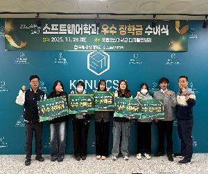 [Event : 2025.11.25.] 지난 달 25일 소프트웨어학과에서는 '2025학년도 2학기 우수 장학금 수여식'을 개최했습니다. 이날 행사에는 김장원 학과장을 비롯한 학과 온병원 교수, 마준 교수와 재학생들이 참석하여 자리를 빛냈습니다. 이번 장학금은 학과 차원의 지원을 넘어, 교수님들이 개별적으로 뜻을 모아 조성한 '교수 지정기부금'으로 수여되어 눈길을 끌었습니다. 제자 양성을 위해 교수진이 직접 마련한 재원인 만큼, 수여식 현장은 스승과 제자 간의 훈훈한 정으로 채워졌습니다. 평소 학업 성적이...